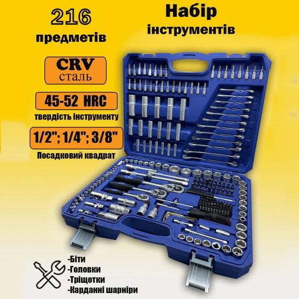 Набір інструментів 216 предметів відрізняється продуманою комплектацією, високою якістю та відмінною ціною, даний набір інструментів для ремонту автомобілів гідно оцінили понад тисячу автомобілістів.