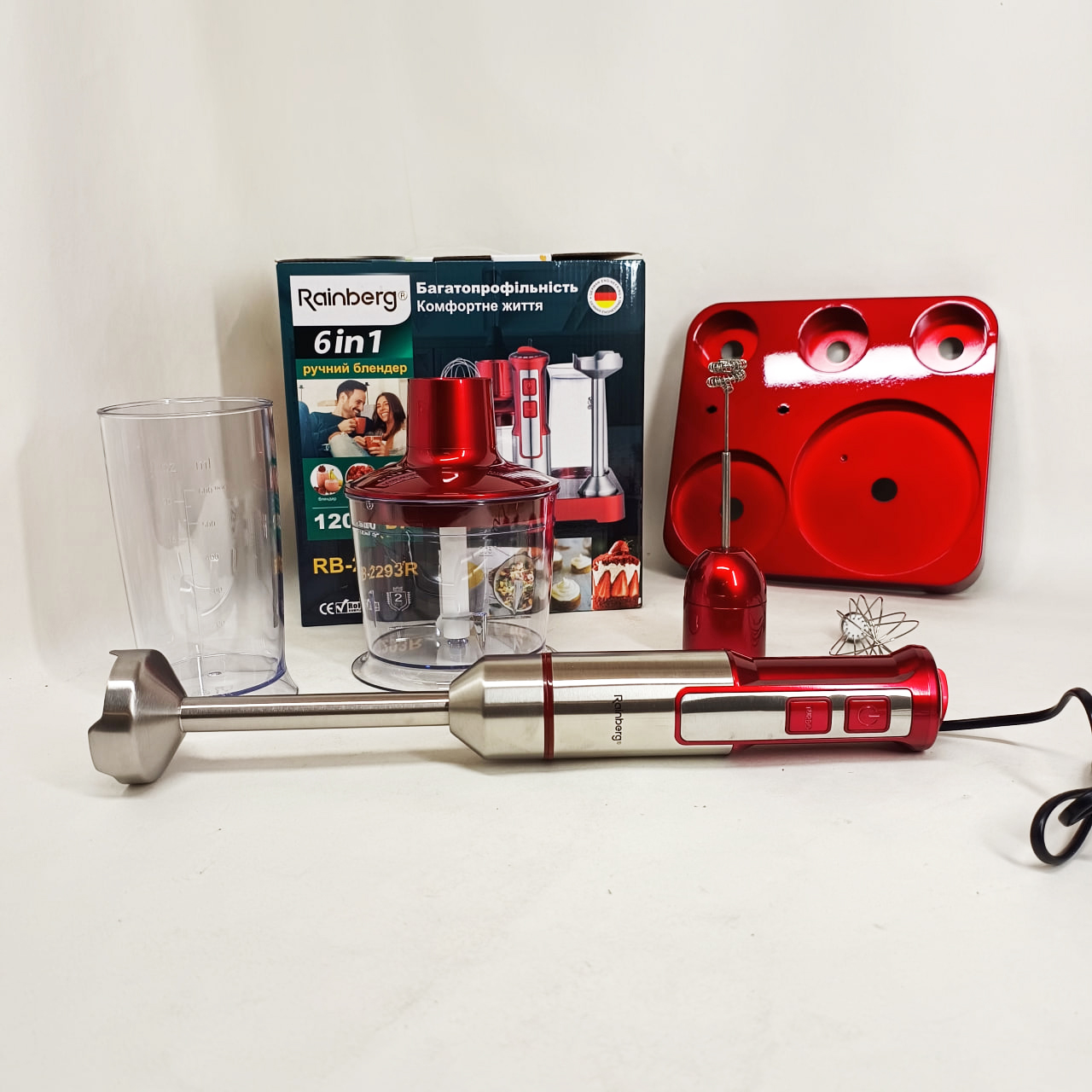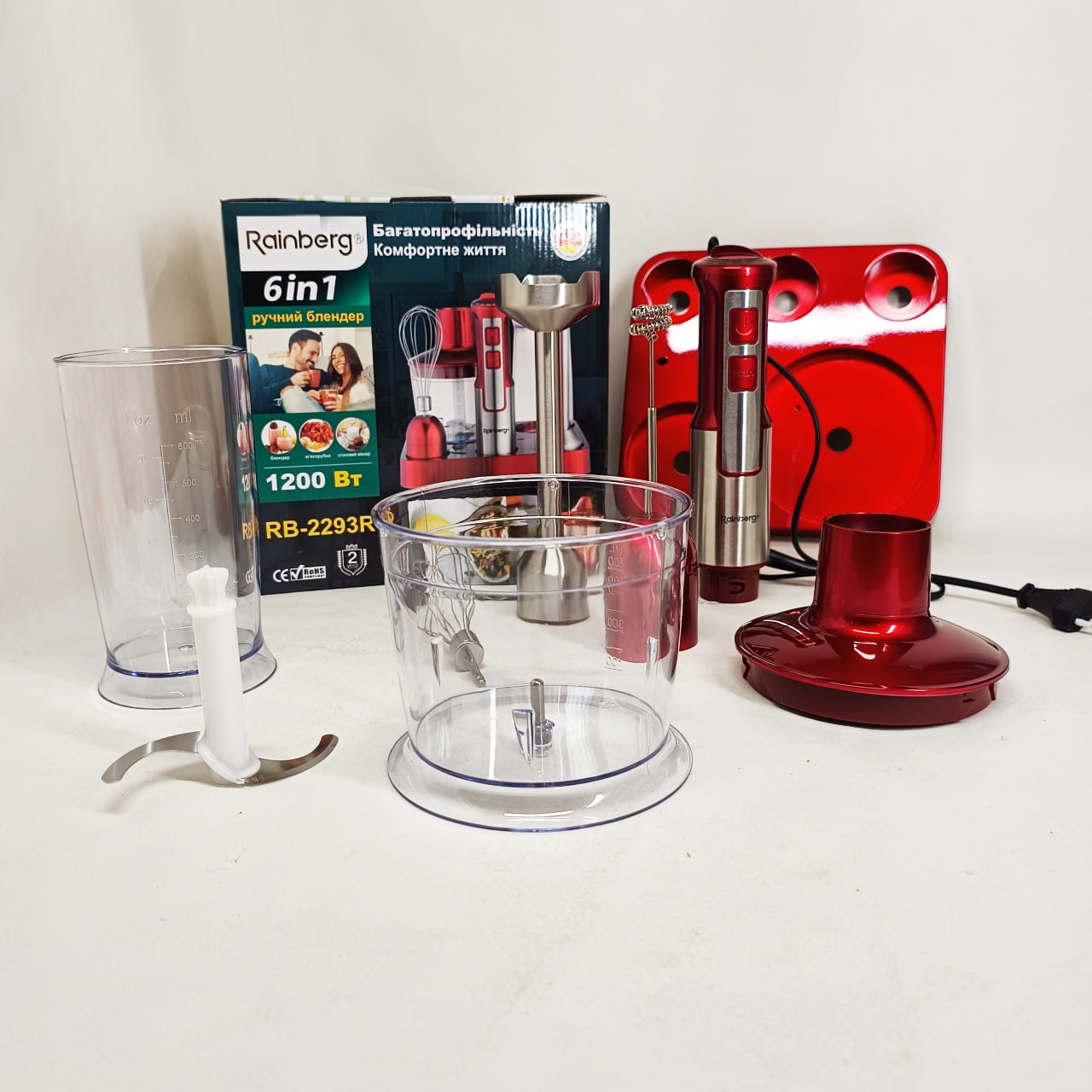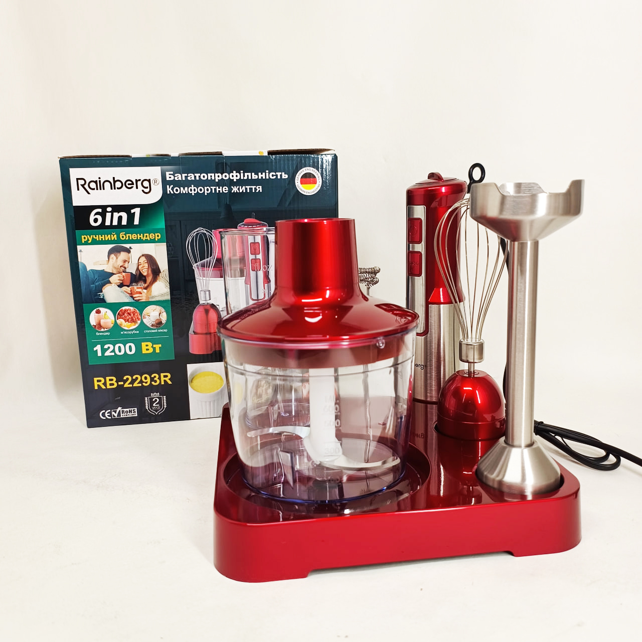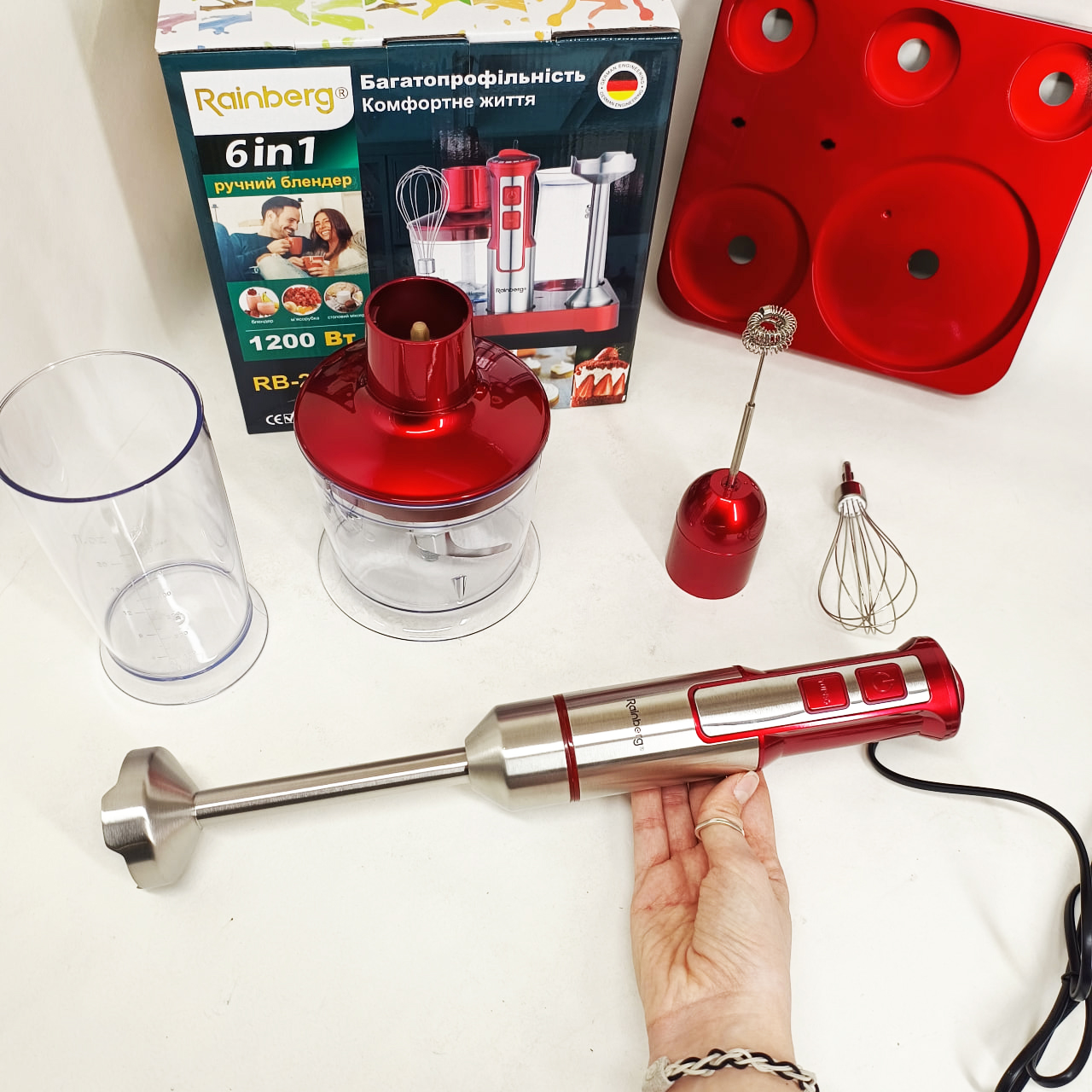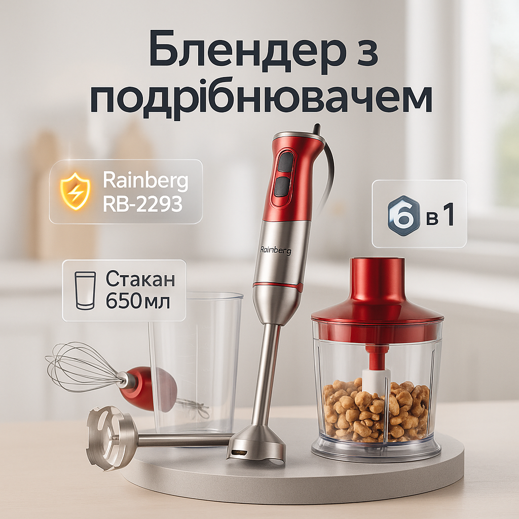 Занурювальний блендер RB-2293 B — це незамінний помічник у вашій кухні. Завдяки потужності 1200 Вт та 20 швидкостям, він з легкістю впорається з подрібненням овочів, фруктів, горіхів, приготуванням пюре, соусів, смузі та навіть збиванням вершків. Зручна ергономічна ручка та компактний дизайн роблять роботу з блендером максимально комфортною. Гострі леза з нержавіючої сталі забезпечують швидку та рівномірну обробку продуктів. Знімні насадки легко мити, а в комплекті є все необхідне для різноманітних кухонних завдань.