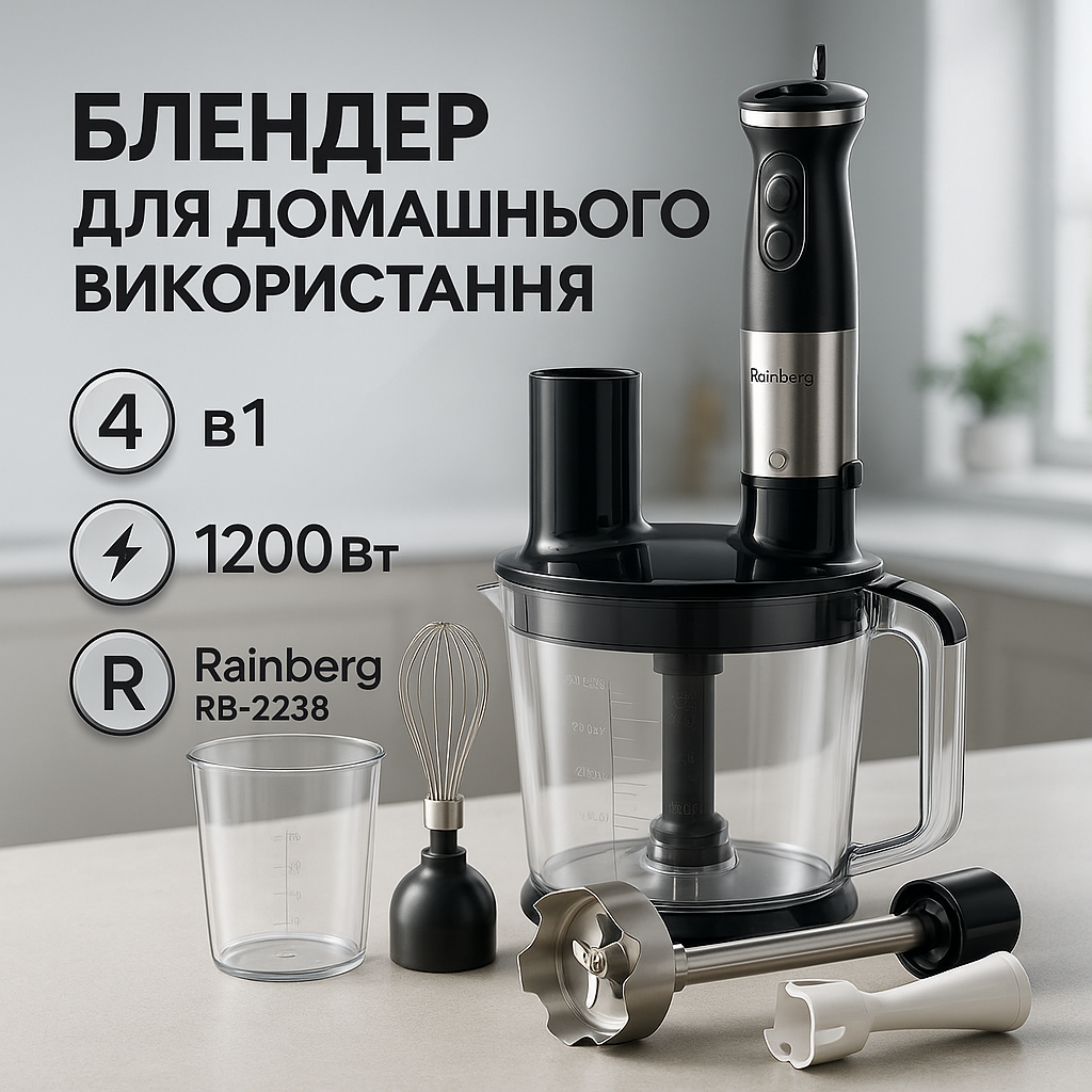 Занурювальний блендер Rainberg RB-2238 – це компактний побутовий прилад потужністю 1200 Вт, який буде простий у використанні, надійний та безпечний. Модель можна використовувати для подрібнення, змішування та збивання продуктів.