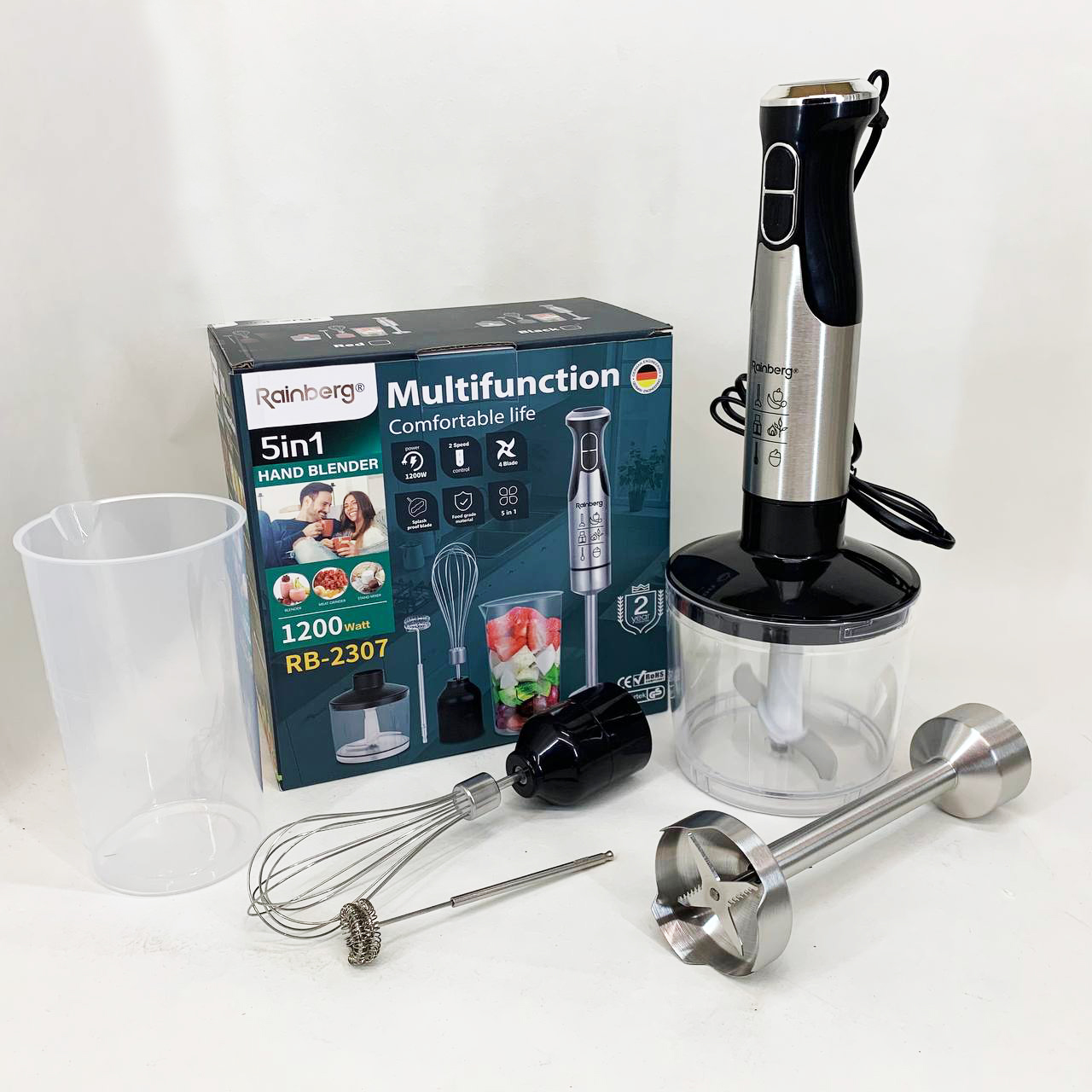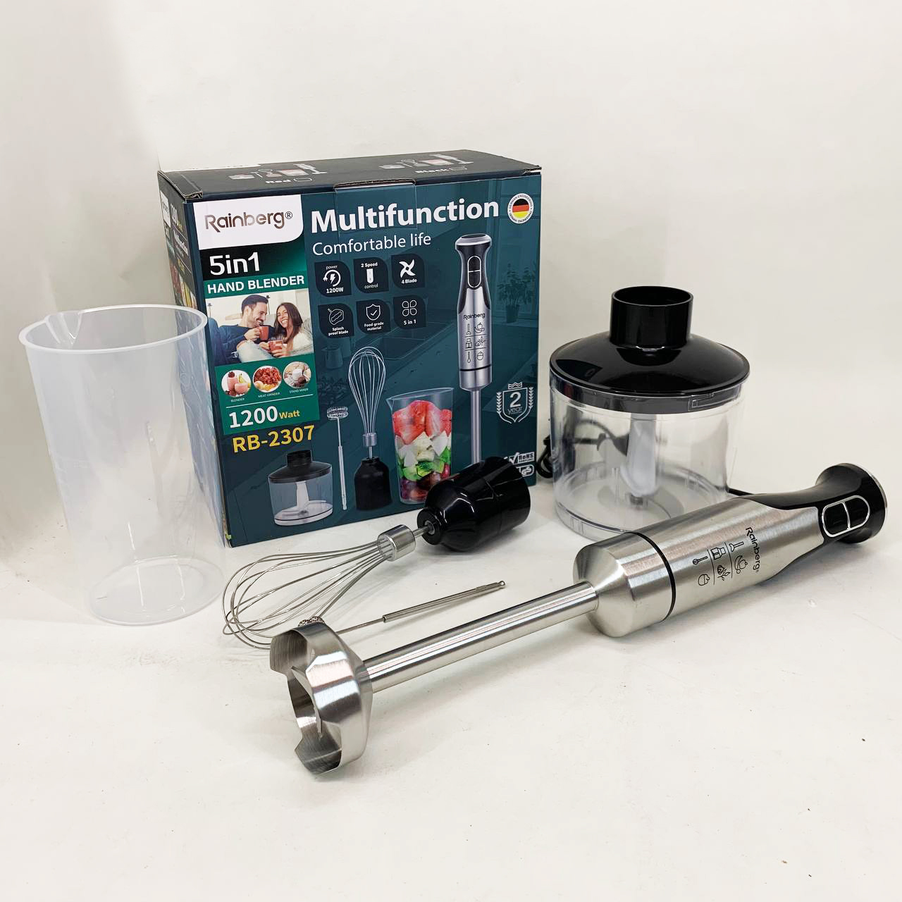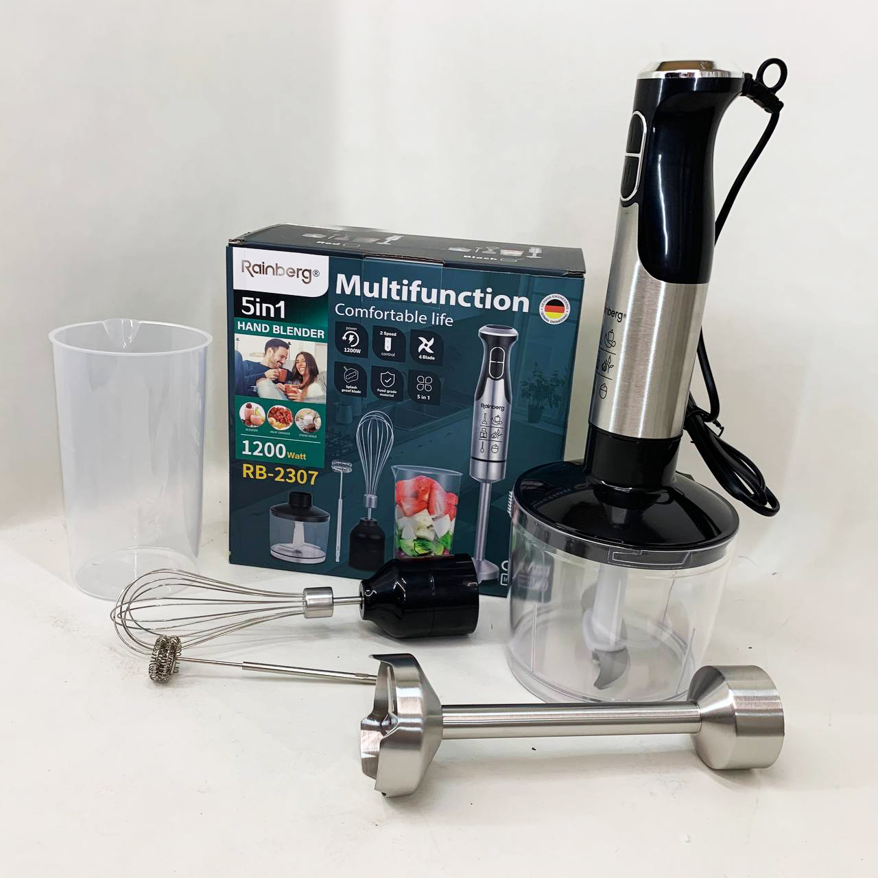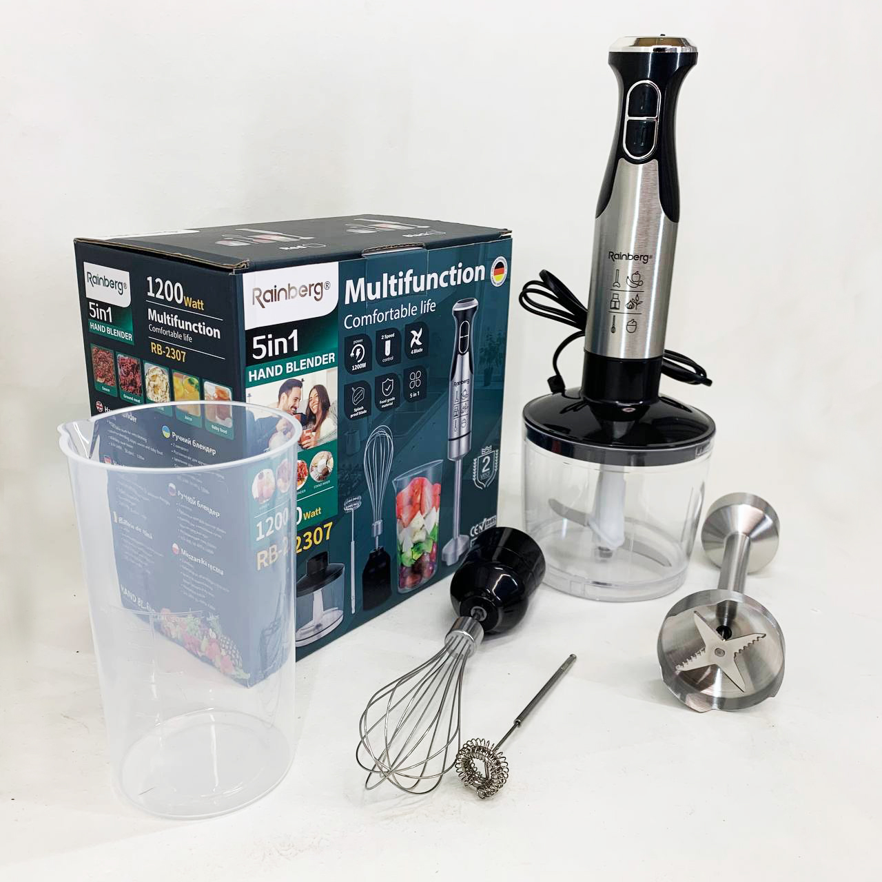 Універсальний блендер Rainberg RB-2307 5 в 1 поєднує функції занурювального блендера, віночка та подрібнювача. Потужність 1200 Вт та 15 швидкісних режимів забезпечують швидке та якісне змішування продуктів.