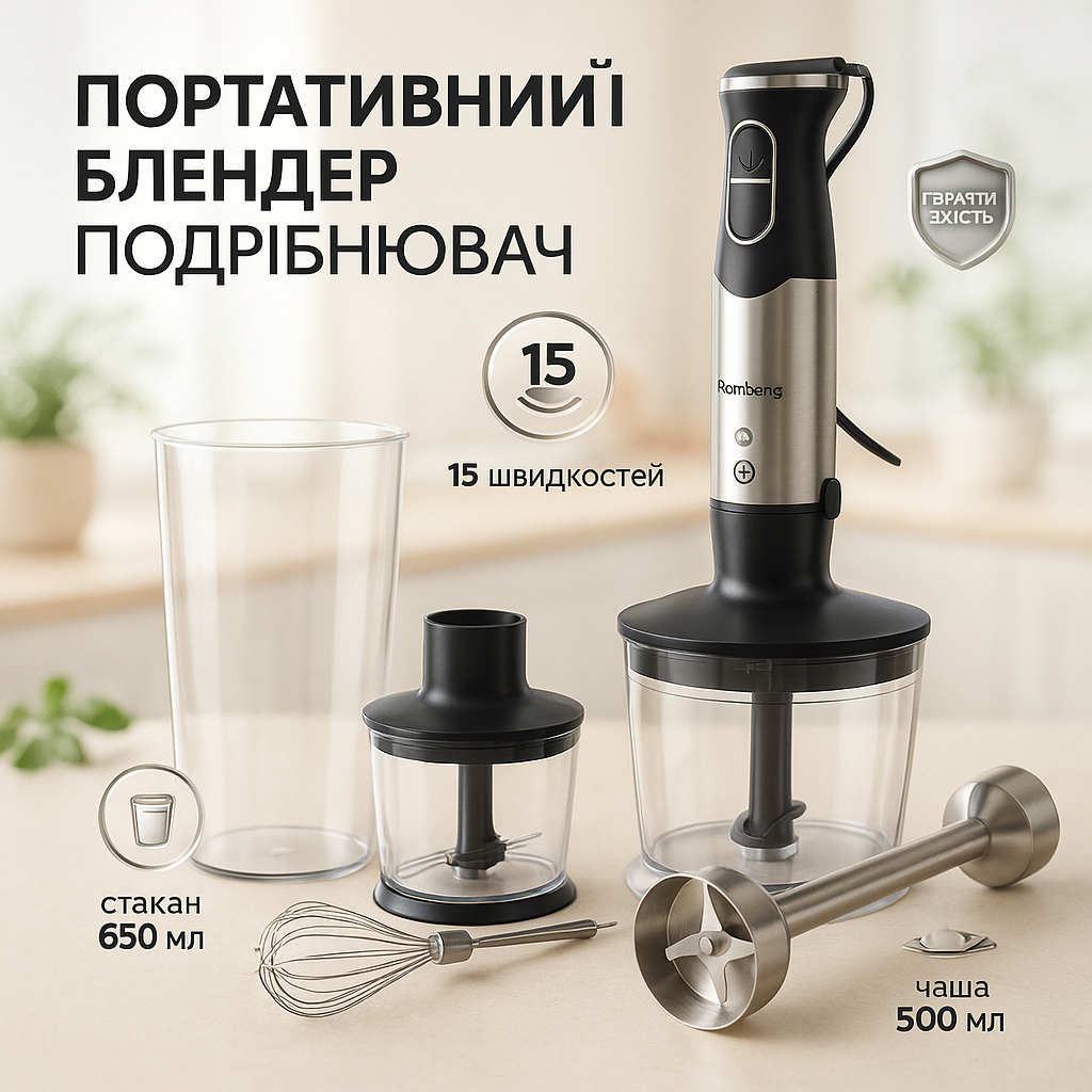 - Насадки: нож-ротор, віночок, подрібнювач (знімні)