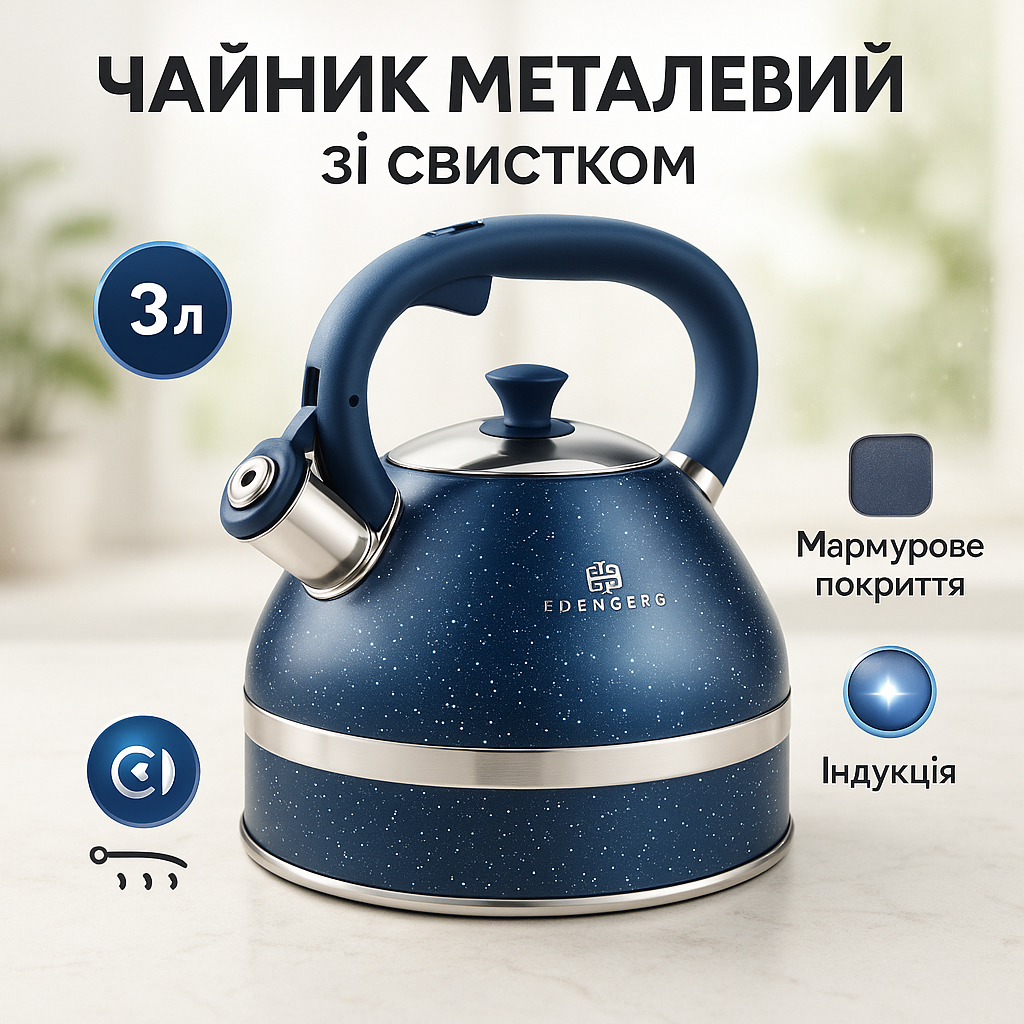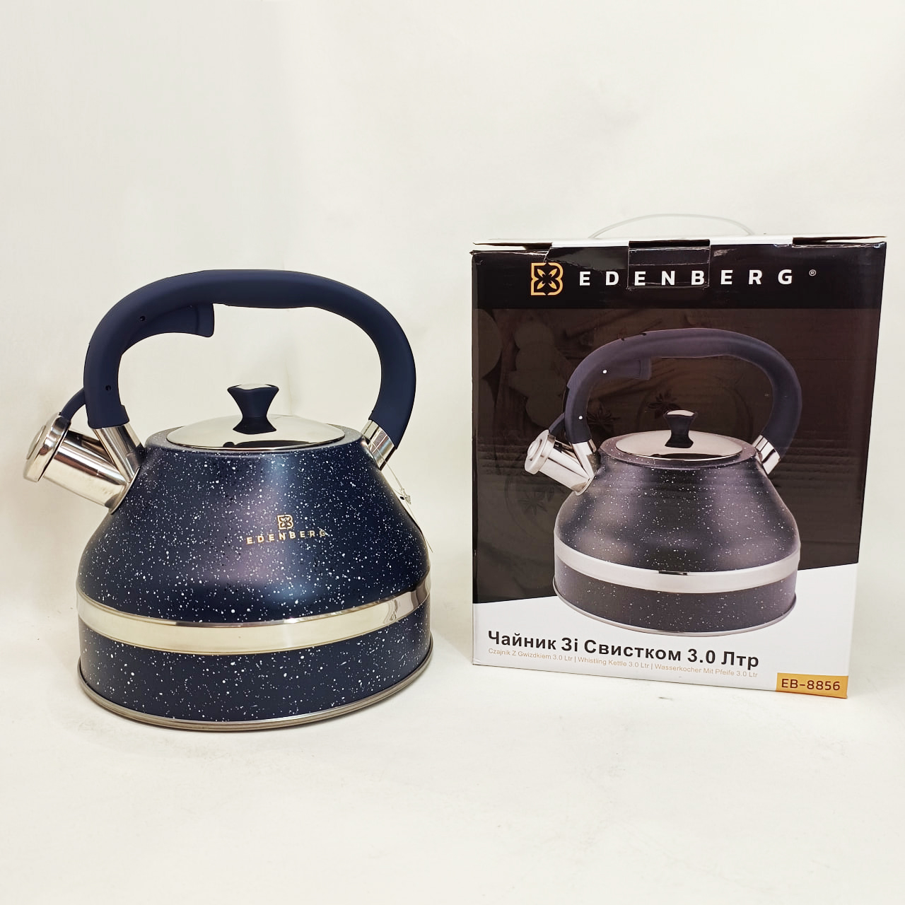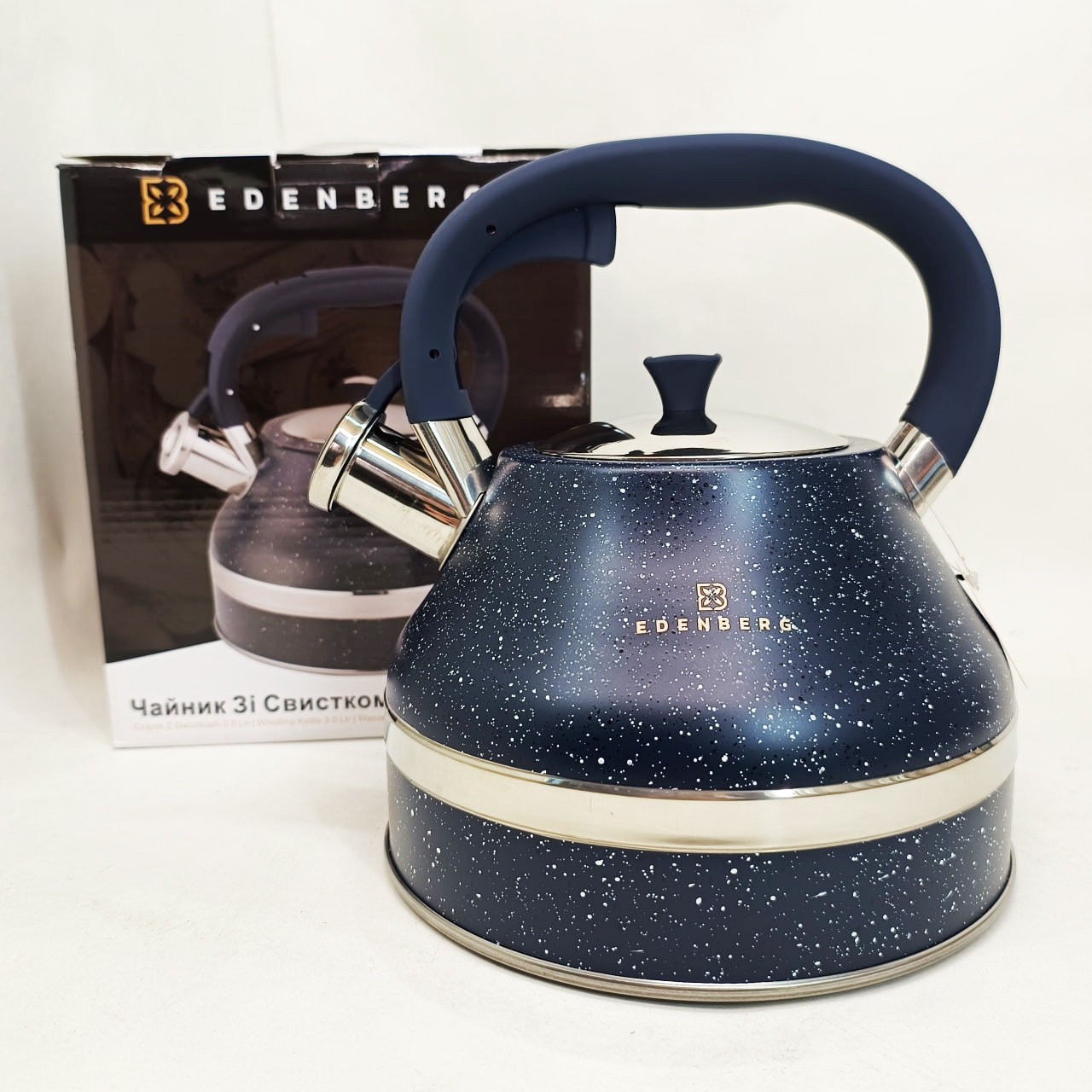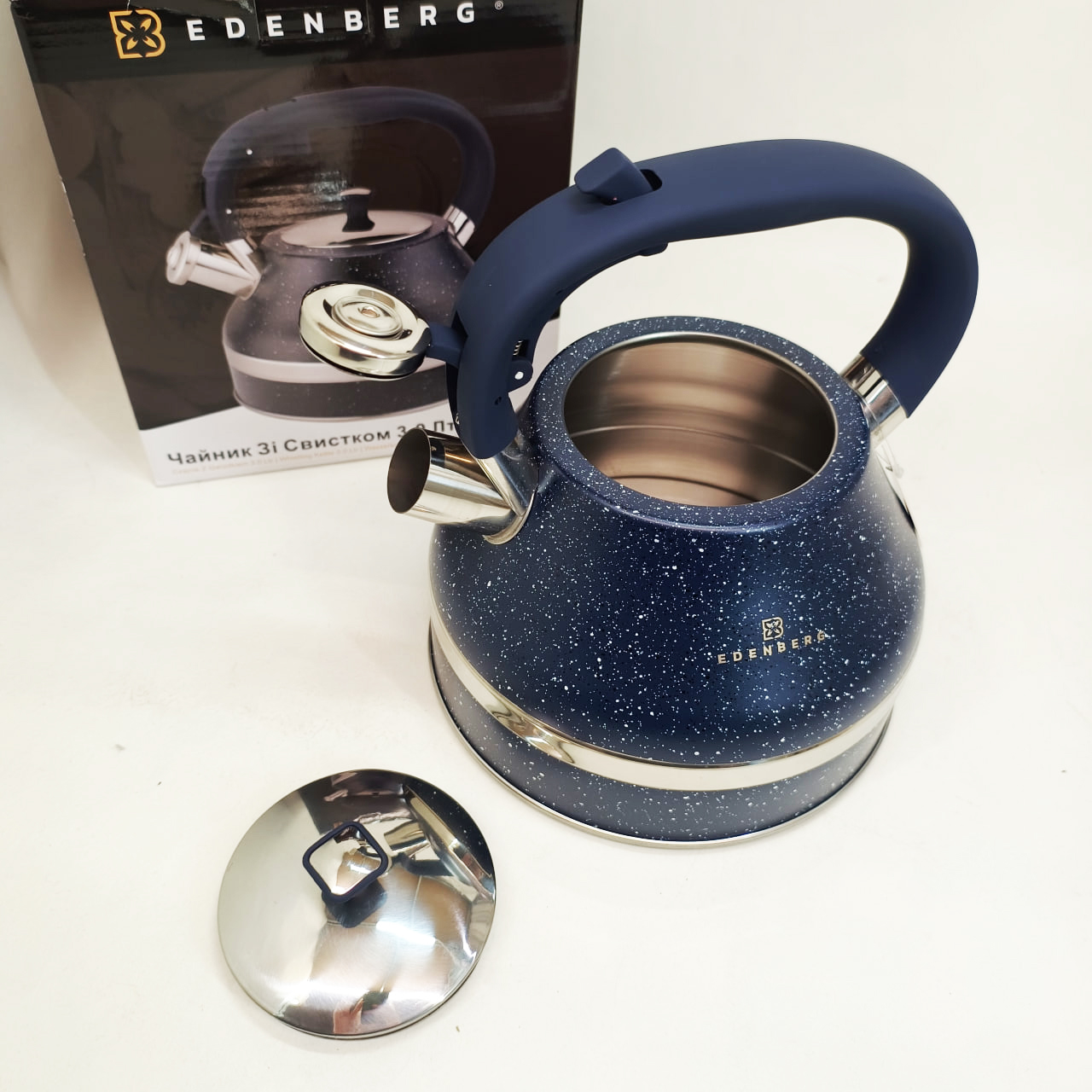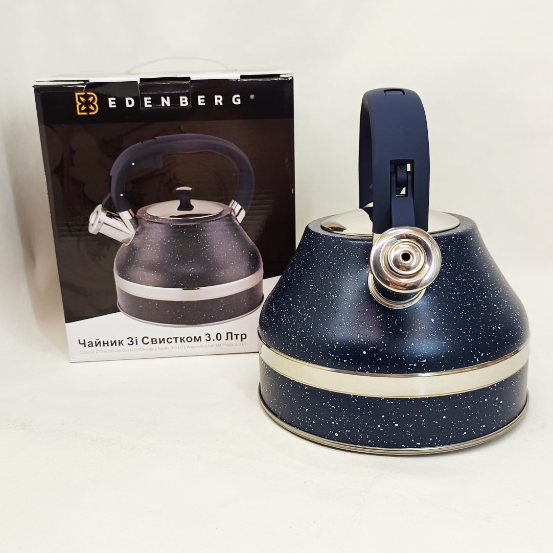 Чайник Edenberg об’ємом 3 літри створений з нержавіючої сталі з зовнішнім мармуровим покриттям, що забезпечує довговічність і безпеку при експлуатації. Ця модель поєднує функціональність і сучасний дизайн, легко вписуючись у будь-який інтер’єр на вашій кухні. Особлива увага приділена універсальності — чайник підходить для всіх типів плит, включаючи індукційні, газові, електричні та склокерамічні, завдяки подвійному капсульному індукційному дну. Зручність використання доповнена ергономічною фіксованою ручкою, яка не нагрівається в процесі кип’ятіння, а зручний свисток з нержавіючої сталі спрацьовує при закипанні води й керується натисканням кнопки.