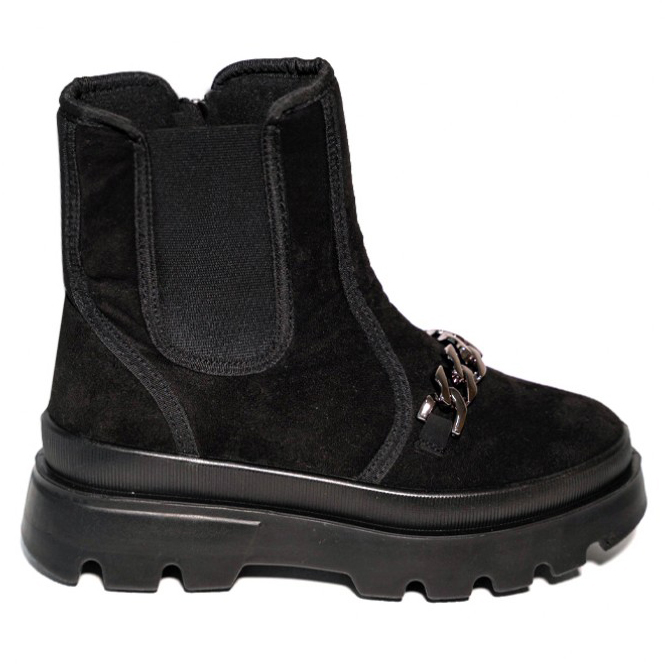 Стильні жіночі челсі — це вдале поєднання модного дизайну та зручності для щоденного носіння. Модель виконана з м’якого чорного замшу, який приємно виглядає й добре тримає форму. Еластичні вставки з боків забезпечують швидке та легке взування, а декоративний ланцюжок на передній частині додає характерного акценту до образу. Висока підошва з протектором створює надійну підтримку і дозволяє впевнено почуватися на будь-якому покритті.