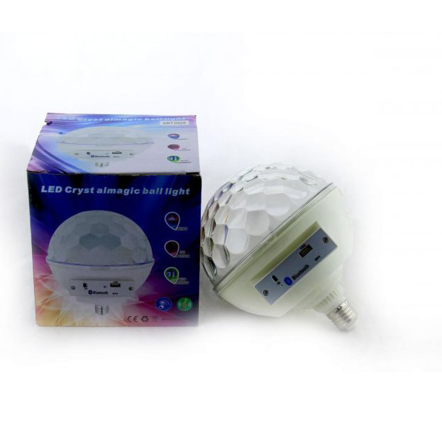 Диско куля LED Cryst almagic ball light E27 997 BT має компактний дизайн у вигляді лампи, що вкручується в стандартний патрон, вбудований модуль бездротового підключення Bluetooth та USB вхід для підключення флешок з музикою у MP3 форматі.
