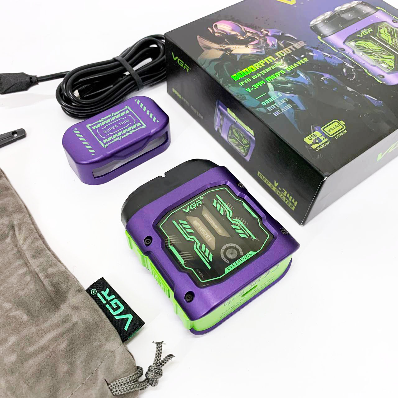 Електроритва VGR V-344 працює від вбудованого літій-іонного акумулятора ємністю 400 мАг. Час зарядки становить лише 1 годину, після чого прилад забезпечує до 60 хвилин автономної роботи. Зарядка здійснюється через USB, що зручно для використання вдома та у поїздках. Леза з нержавіючої сталі відрізняються міцністю, довговічністю та забезпечують точне гоління без подразнення шкіри.