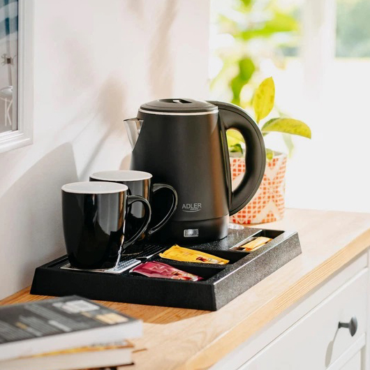 Зручний набір для готелів, апартаментів та гостьових кімнат. Включає металевий чайник із подвійною стінкою та міцну вологостійку підставку з відділеннями для напоїв. Практичне рішення, яке дозволяє гостям швидко приготувати гарячі напої без зайвих дій.