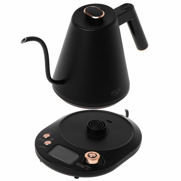 Чайник AD 1349 – Gooseneck — ідеальне рішення для любителів кави, які цінують точність та контроль над процесом заварювання. Оснащений функцією точного нагрівання води до певних температур: 91°C, 93°C або 96°C, він дозволяє ідеально налаштувати температуру для різних способів заварювання кави. Функція точного нагрівання води була спеціально розроблена для заварювання меленої кави у зернах. Завдяки можливості вибору однієї з трьох температур ви можете точно контролювати процес екстракції, що дозволяє отримати найкращий смак та аромат від кожної чашки кави.