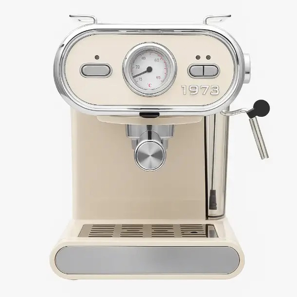 Кавоварка Silver Crest SEMC 1100 A1 Retro 1973 — стильна ріжкова еспресо‑машина в кремовому ретро-дизайні. Потужність 1100 Вт і тиск 15 бар дозволяють готувати насичену каву з густою кремою. Машина має резервуар для води об’ємом приблизно 1 л, який знімається для зручного наповнення та очищення.