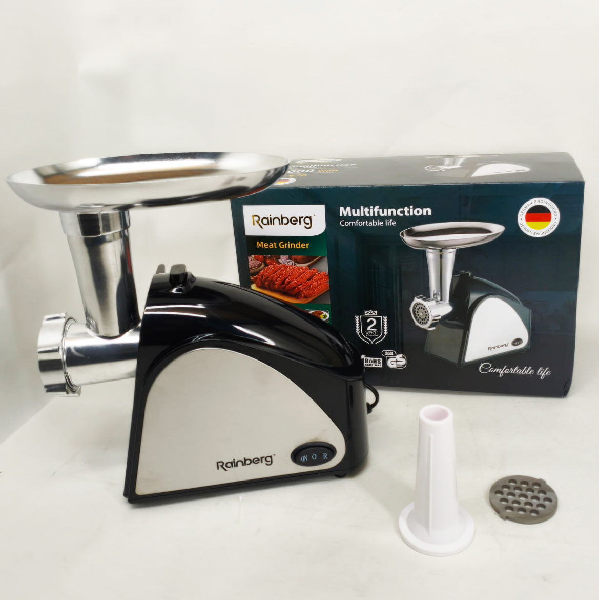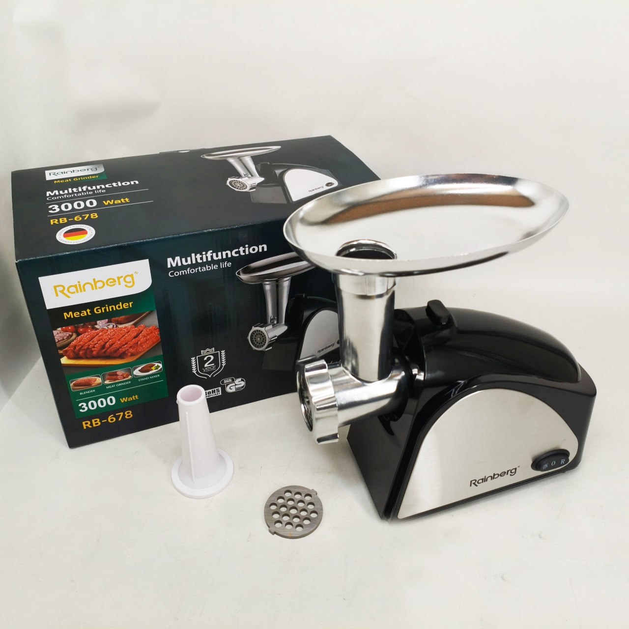 Електром’ясорубка Rainberg RB-678 – потужна, компактна та тиха електрична м’ясорубка від виробника Rainberg потужністю 3000 Ватт. М’ясорубка призначена для виготовлення фаршу з м’яса, риби, грибів тощо.