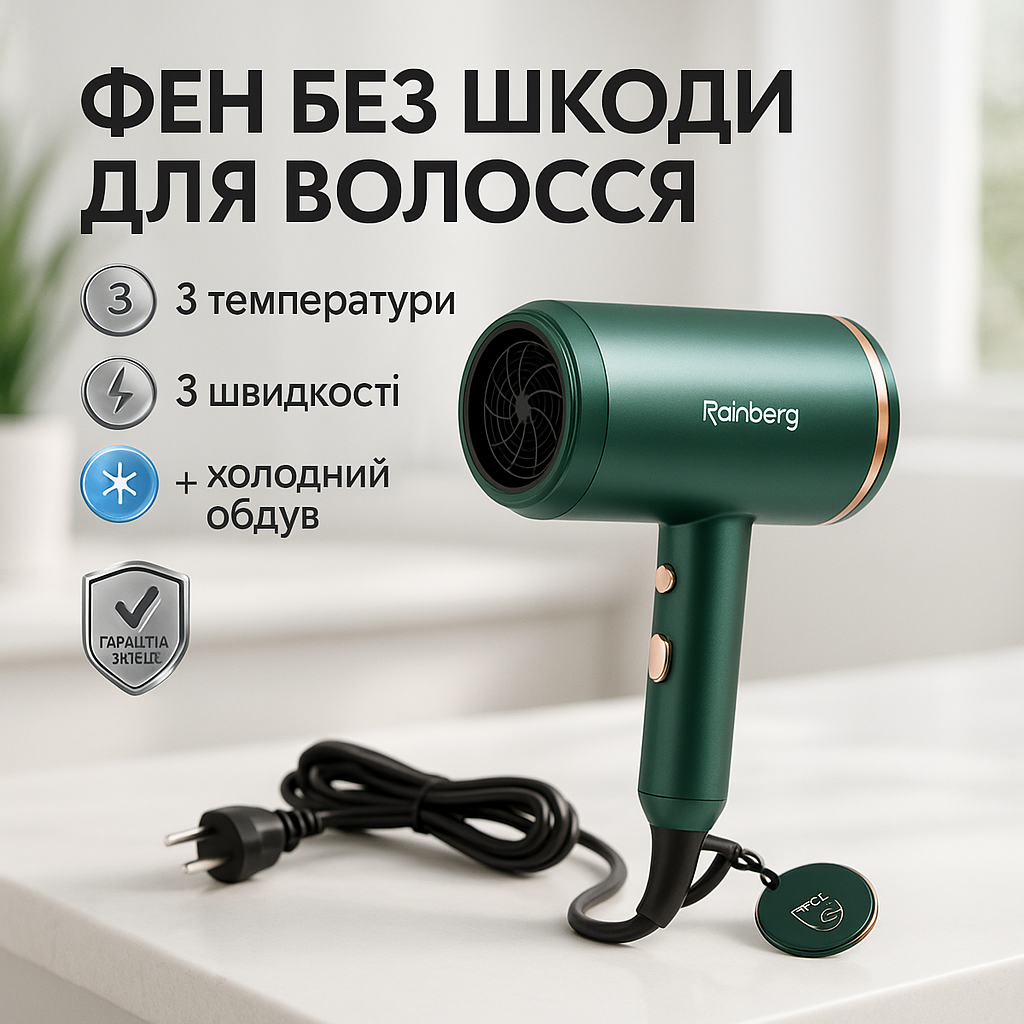 Rainberg RB-2212 – це зручний та функціональний фен, який відрізняється своїм дизайном, доступною ціною та при цьому великим набором функцій. Відрізняється своєю якістю, надійністю, дбайливо сушить волосся. Має три швидкості та можливість холодного обдування.