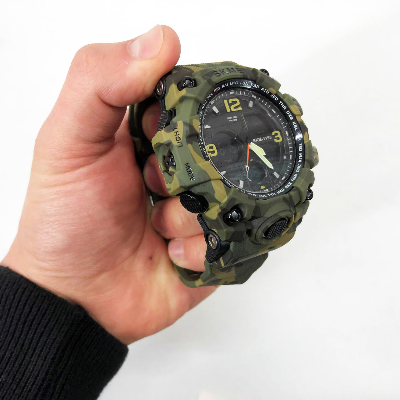 Годинник SKMEI 1155BCMGN GREEN CAMO — це стильний, брутальний аксесуар, створений для тих, хто веде активний спосіб життя та цінує надійність у кожній деталі. Завдяки маскувальному (камуфляжному) дизайну, він чудово підходить для військових, туристів, мисливців та поціновувачів тактичного стилю. Корпус виготовлений із міцного пластику, стійкого до ударів, а ремінець комфортно фіксує годинник на зап’ясті. Модель поєднує аналогову та цифрову індикацію, що додає зручності у повсякденному використанні.