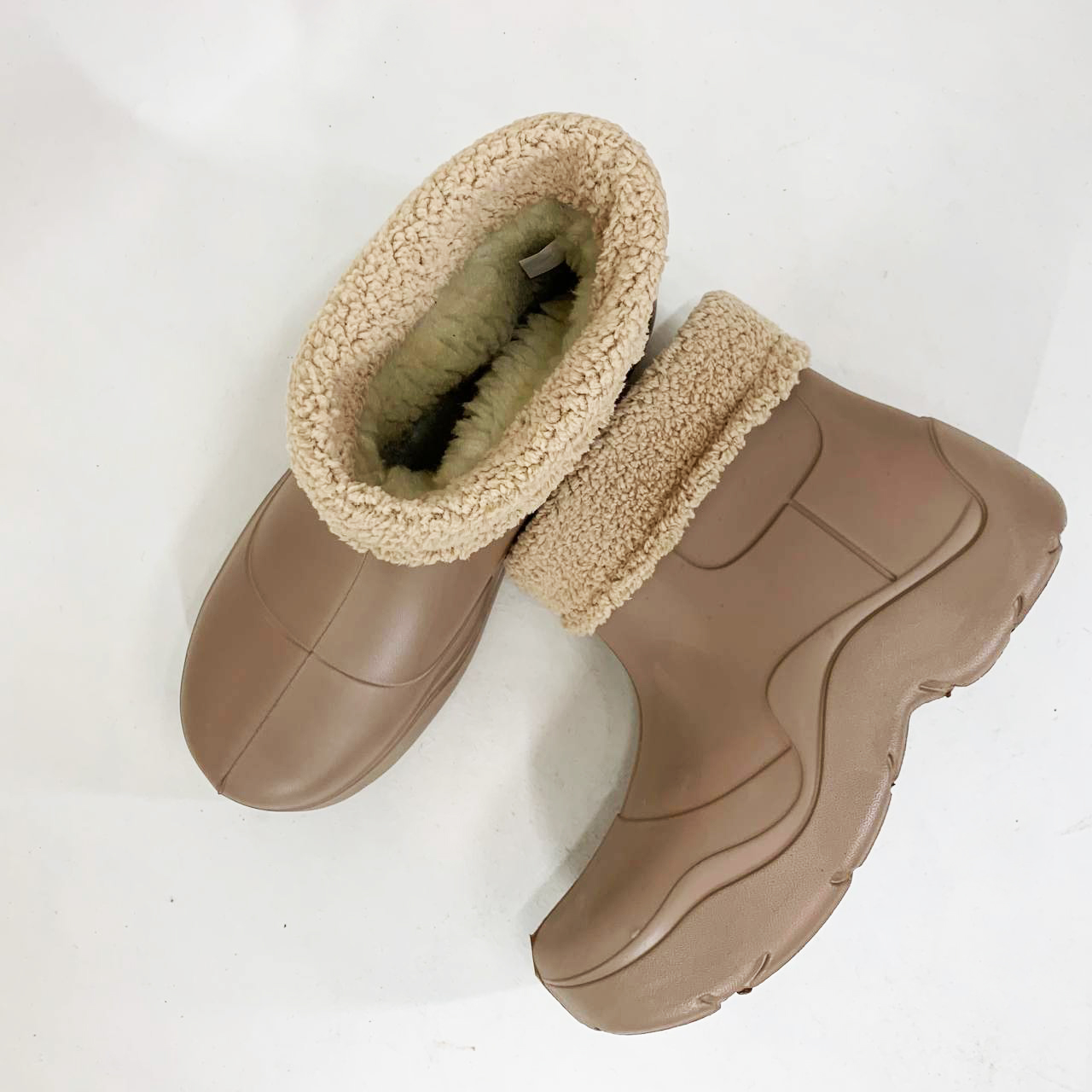 Жіночі гумові черевики — це практичне та зручне рішення для холодної і вологої пори року. Модель має стильний дизайн у світло-бежевому кольорі, що робить її універсальною для повсякденного носіння. Черевики виготовлені з литого водонепроникного матеріалу, доповнені утеплюючим внутрішнім оздобленням зі штучної вовни, що забезпечує тепло та комфорт навіть у морозні дні.