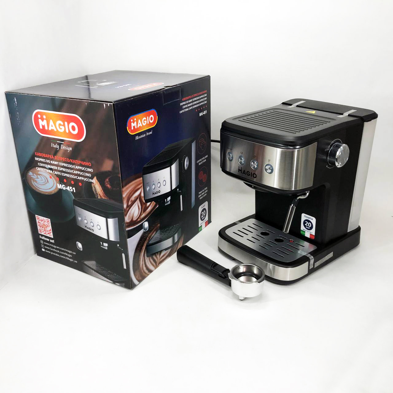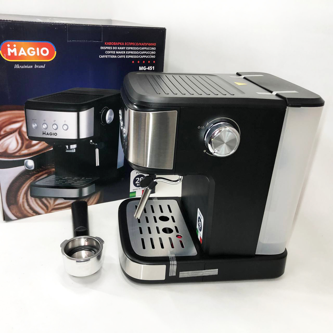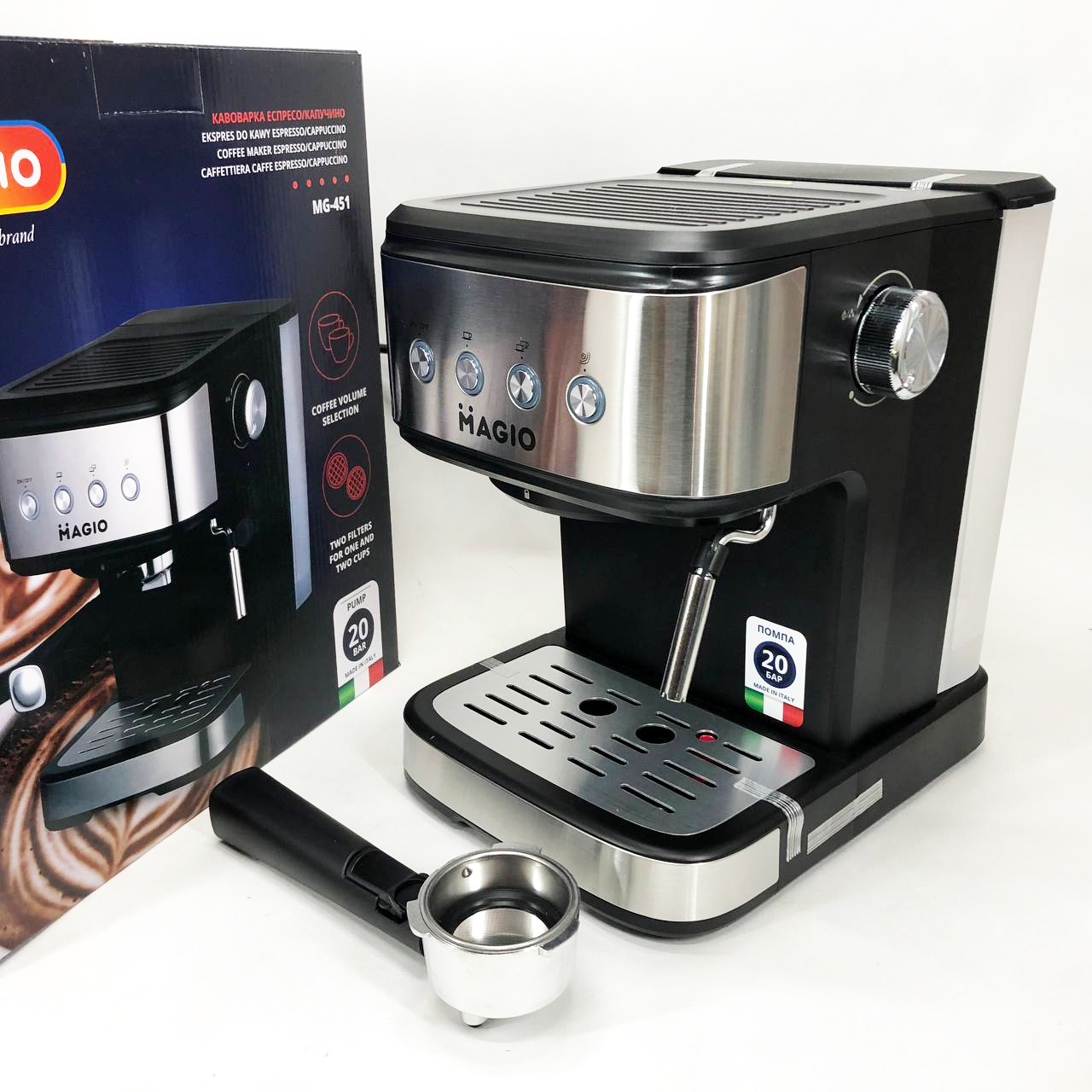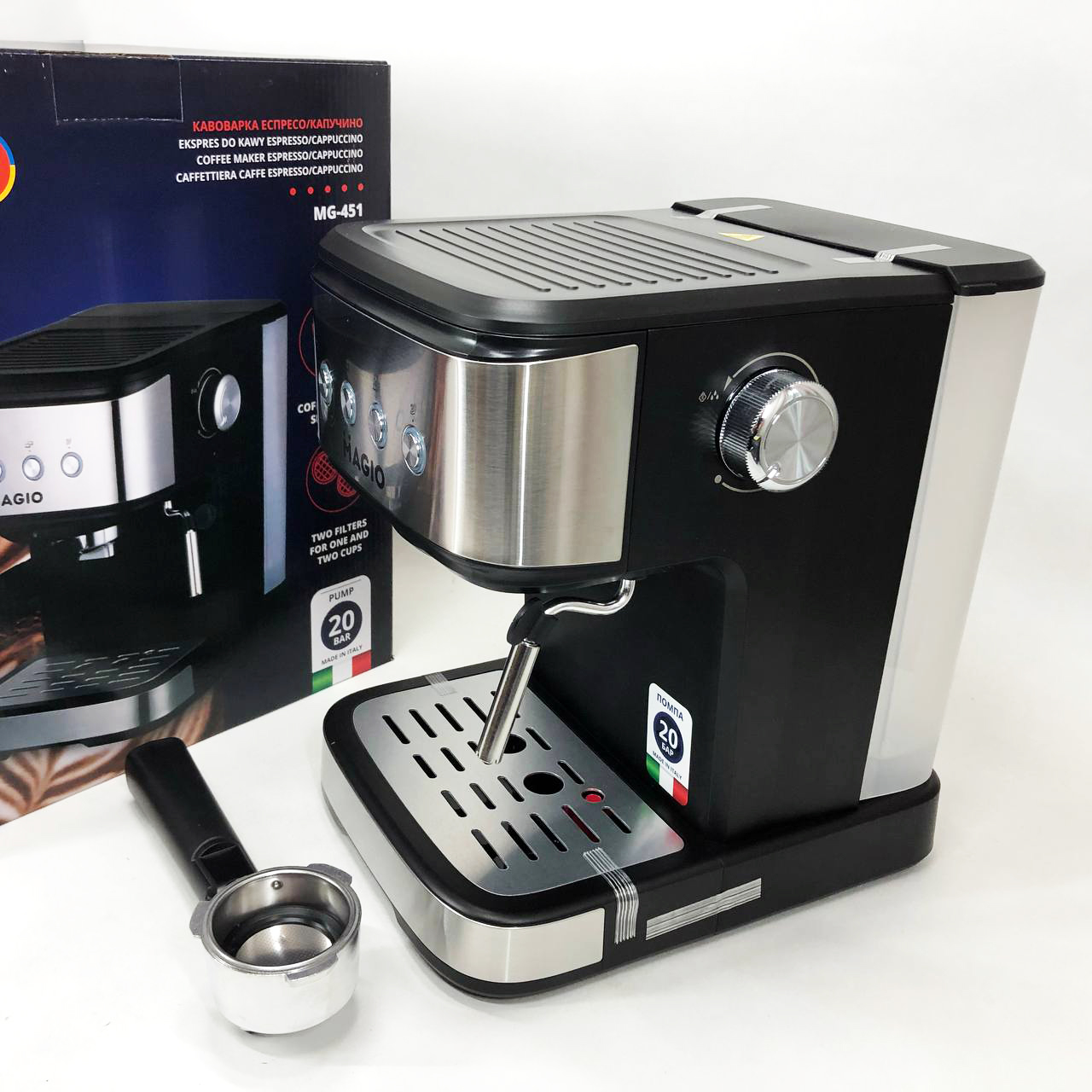 Еспресо-кавоварка MG-451 розроблена для справжніх цінителів кави. Адже з її допомогою Ви зможете приготувати не тільки смачну каву, але ще капучіно та латте. При цьому процес приготування повністю функціональний та практичний. Італійська помпа робить тиск у 20 бар і зробить смак кави ще більш ароматною та насиченою. Фільтр із подвійними стінками приготує напій із густою пінкою, а також забезпечить стійку температуру та тиск при приготуванні кави. Капучинатор приготує ідеальну молочну піну, як справжній барист. Гладкий корпус та компактний дизайн ідеально поєднуються з будь-яким інтер’єром. У ній чудово поєднуються стиль і практичність.