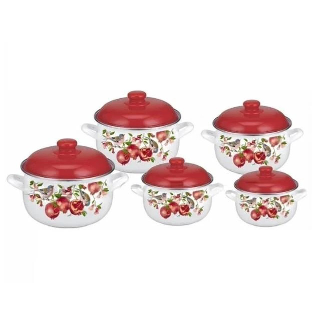 Турбо індукційне дно забезпечує швидке та рівномірне нагрівання, дозволяючи готувати без пригорання та перевитрати енергії. Набір підходить для всіх типів плит, включаючи індукційні. Металеві кришки з термостійким емалевим покриттям щільно прилягають, зберігаючи тепло та аромат приготованих страв.