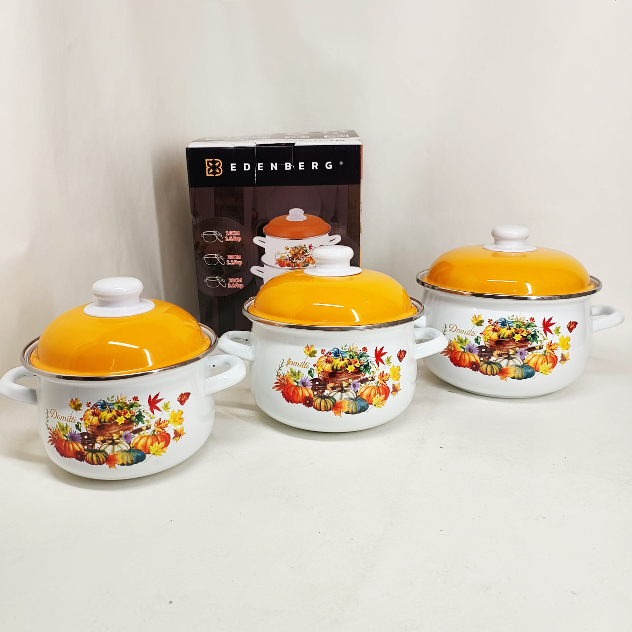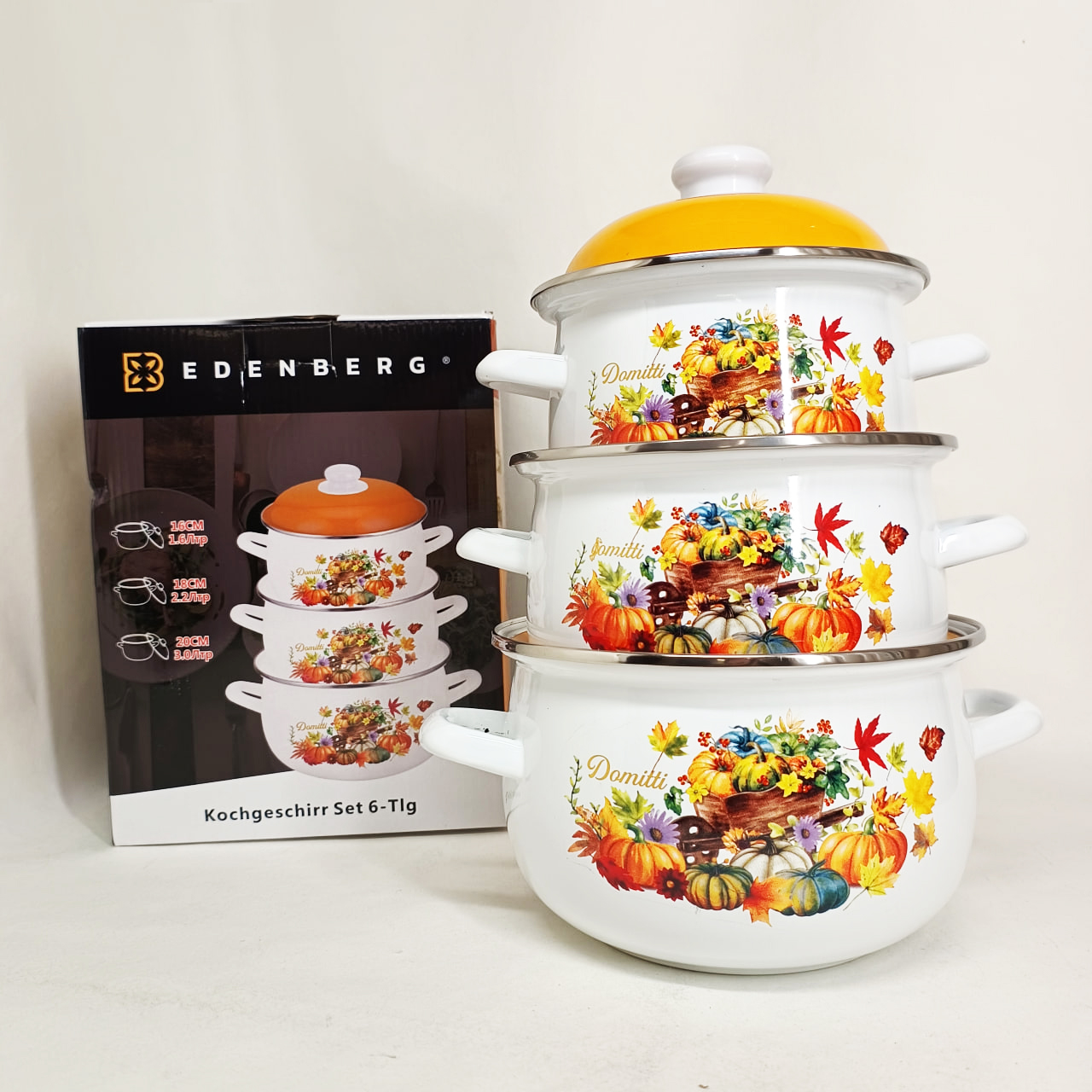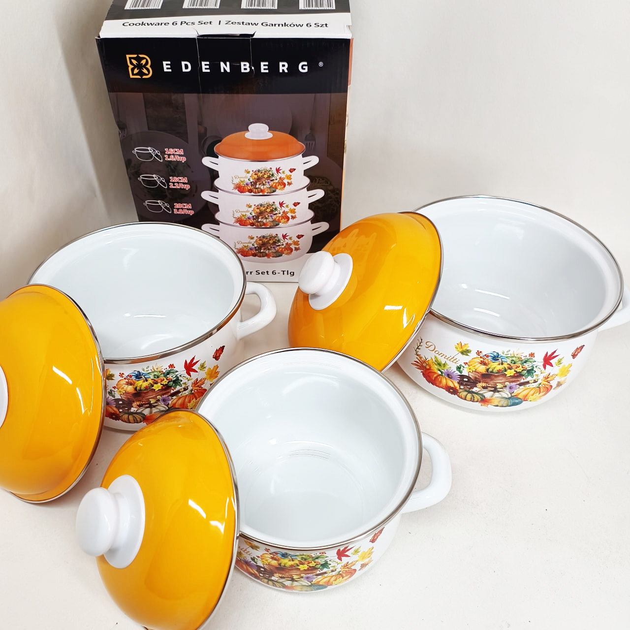 - У комплект входять шість предметів: три каструлі різного об’єму та металеві кришки до кожної.