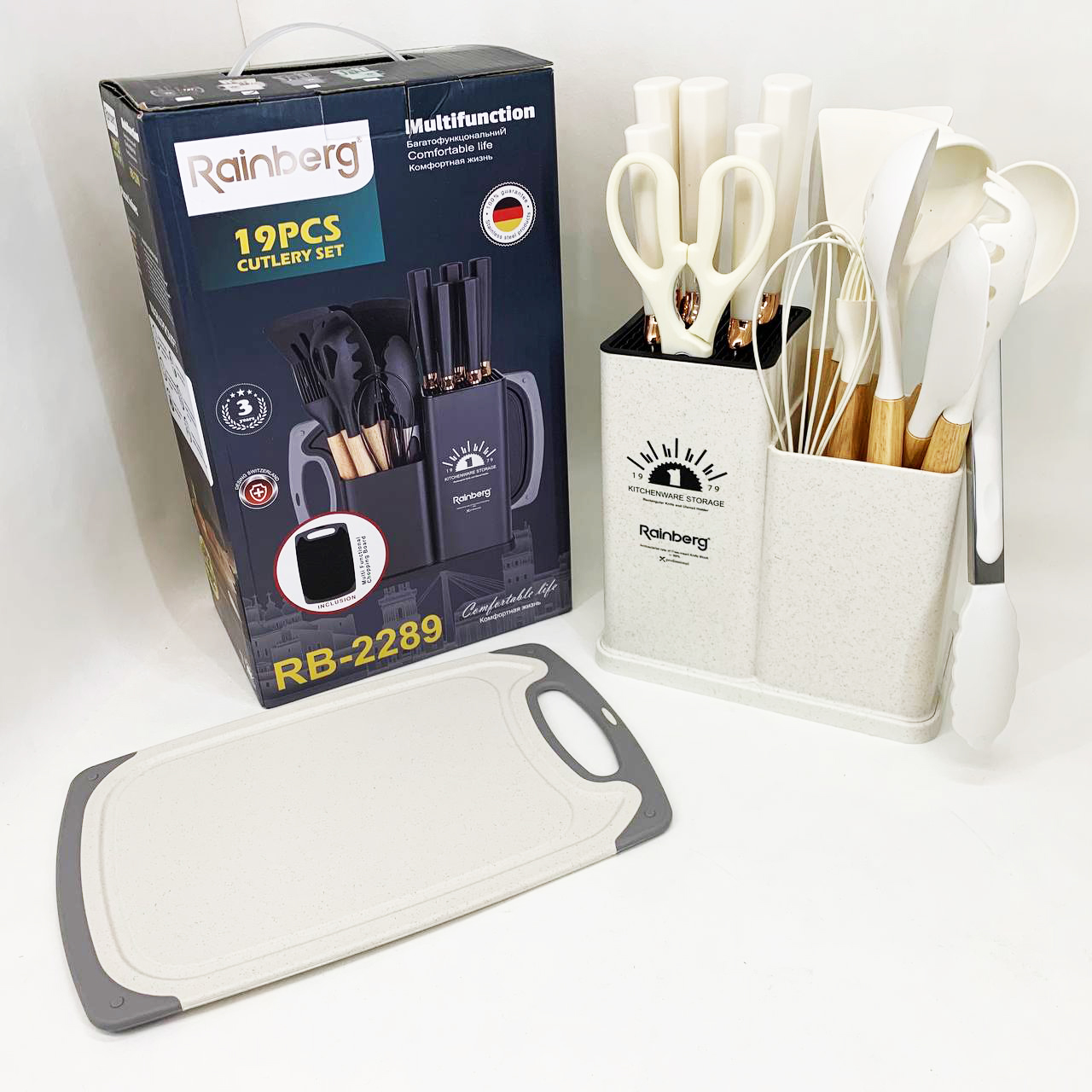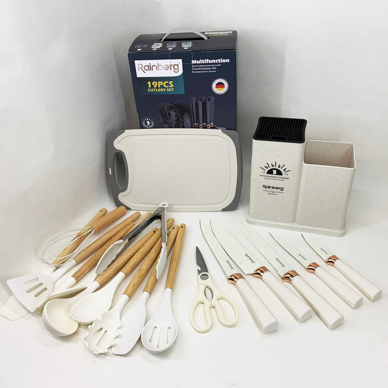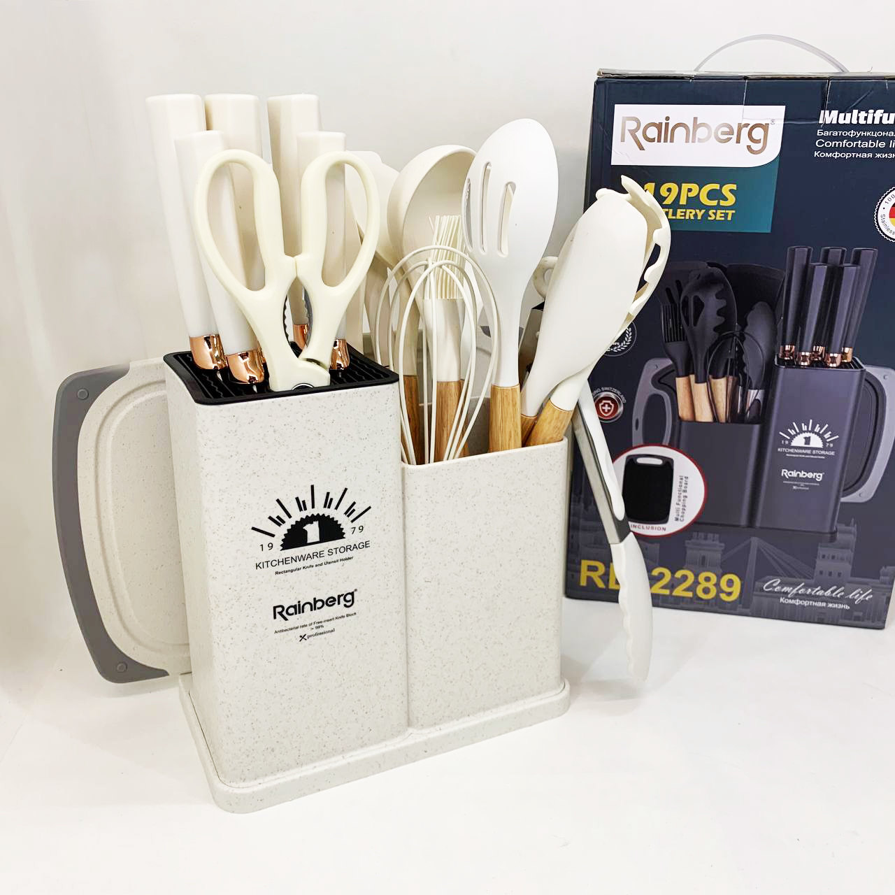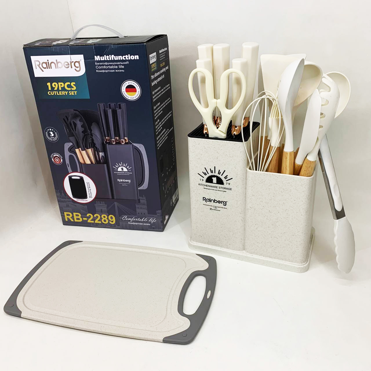 - Склад комплекту: 11 силіконових поварешок, 5 ножів (кухарський, універсальний, для хліба, для овочів, для очищення шкірки), ножиці, подвійна підставка для зберігання.