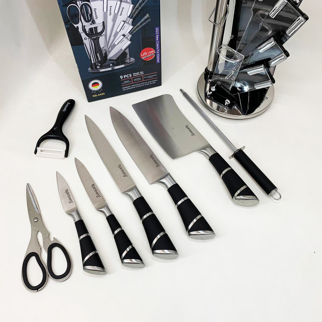 Набір ножів Rainberg RB-2499 — це стильне та функціональне рішення для сучасної кухні. У комплект входить 9 предметів, включаючи 5 універсальних ножів, кухонні ножиці, точило, овочечистку та обертову підставку. Завдяки ергономічним ручкам та гострим лезам з нержавіючої сталі, набір забезпечує точне та комфортне нарізання будь-яких продуктів — від овочів до м’яса.