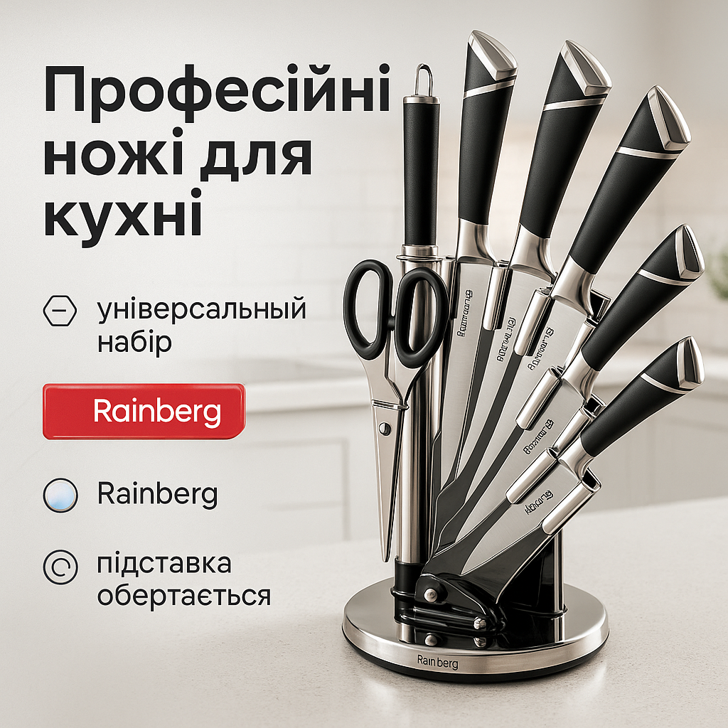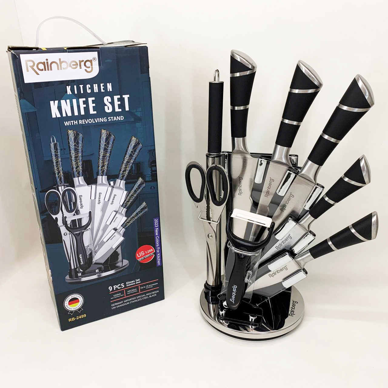 Компактна обертова підставка не тільки додає естетики до кухонного простору, а й дозволяє зручно зберігати всі елементи набору під рукою. Rainberg RB-2499 стане ідеальним помічником як для повсякденного приготування, так і для кулінарних експериментів.