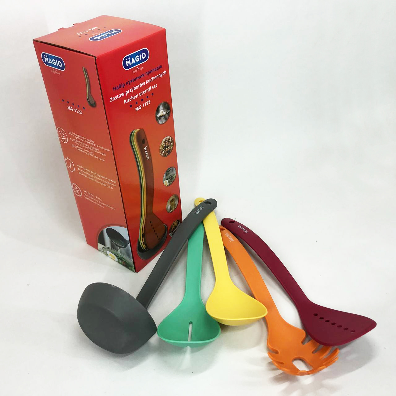 MAGIO MG-1123 стане ідеальним інструментом для домашніх кулінарів, які прагнуть зручно і безпечно готувати різноманітні страви щодня. Набір підходить власникам кухонного посуду з антипригарним покриттям, оскільки матеріали аксесуарів не пошкоджують поверхню сковорідок та каструль. Це також практичний вибір для сімей, де потрібен повний комплект зручних інструментів для салатів, супів, макаронів та інших страв. Зручна підставка заощадить місце і дозволить легко підтримувати порядок на кухонній робочій поверхні.