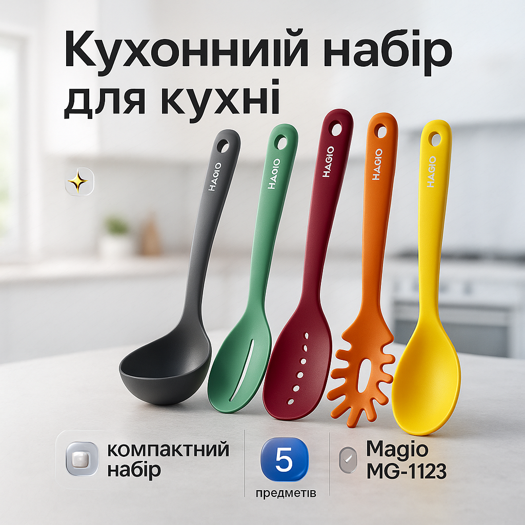 Кухонний набір MAGIO MG-1123 – це оптимальне рішення для тих, хто цінує комфорт та зручність у процесі приготування їжі. Завдяки комплекту з п’яти професійних аксесуарів з пластика та нейлону, ви отримаєте інструменти, які збережуть цілісність вашої посуду з антипригарним покриттям та полегшать щоденне приготування.