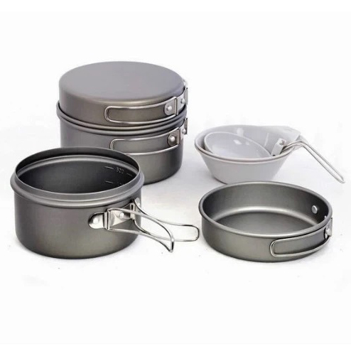 - Практичний комплект: дві каструлі (1.2 л і 0.9 л), дві піали, дві сковорідки, складний половник і власний чохол – все необхідне в одному наборі.