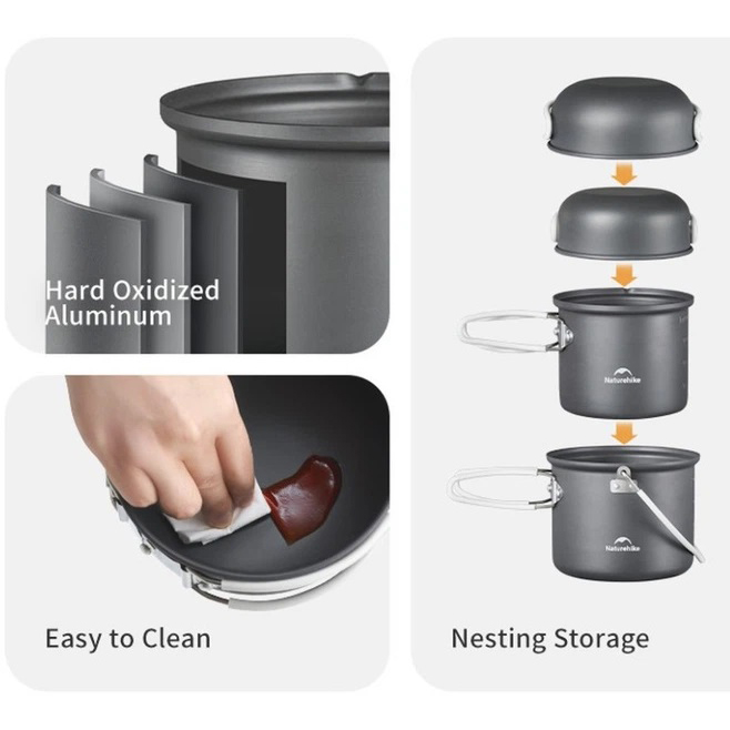 Набір похідного посуду Naturehike NH18T018-G призначений для приготування їжі на газовому пальнику або на багатті. Сумарного обʼєму достатньо для приготування перших та других страв на кількох осіб у кемпінгу, на пікніку та в умовах походу.