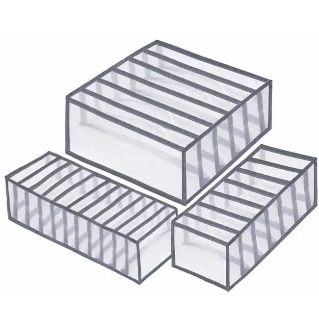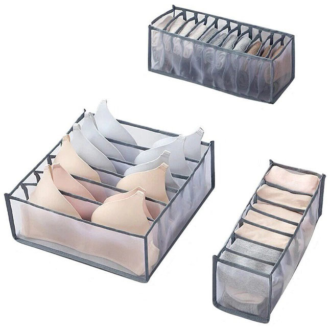 У набір входить 3 місткі органайзери різного розміру на 6, 7 та 11 осередків, які розділені сітчастими перегородками. Це дозволить вам розкладати білизну по відділеннях відповідного розміру по кольоровій гамі або за призначенням. Сітчастий матеріал також покращує прохідність повітря, робить зберігання гігієнічнішим. А ще крізь нього можна побачити вміст — отже, спроститься пошук потрібної речі у повсякденному поспіху.