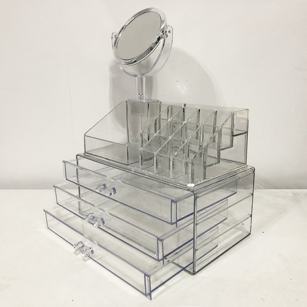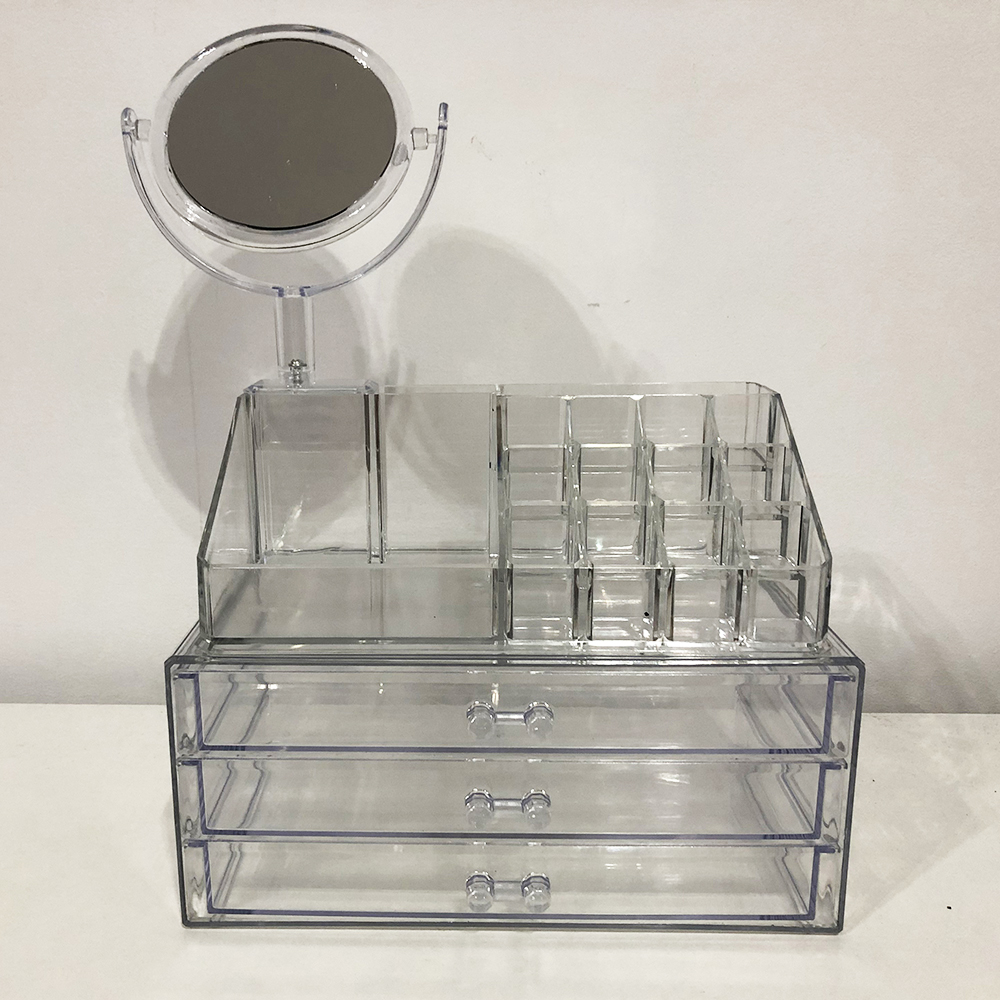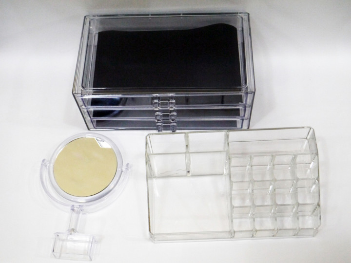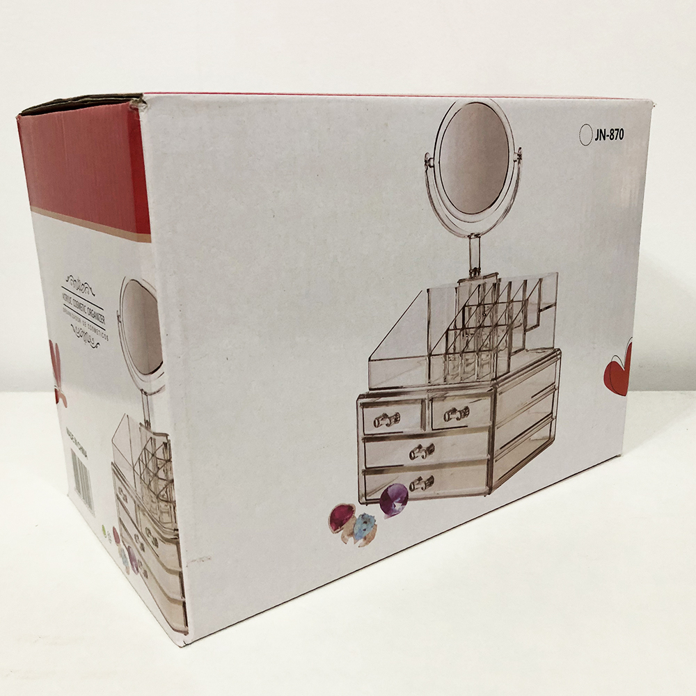 Акриловий органайзер для косметики з дзеркалом Cosmetic Storage Box модель JN 878 дозволяє зберігати косметику і прикраси красиво і при цьому не займаючи багато місця на туалетному столику. Прозорий пластик дозволяє бачити всю косметику і аксесуари, не заглядаючи в нього.
