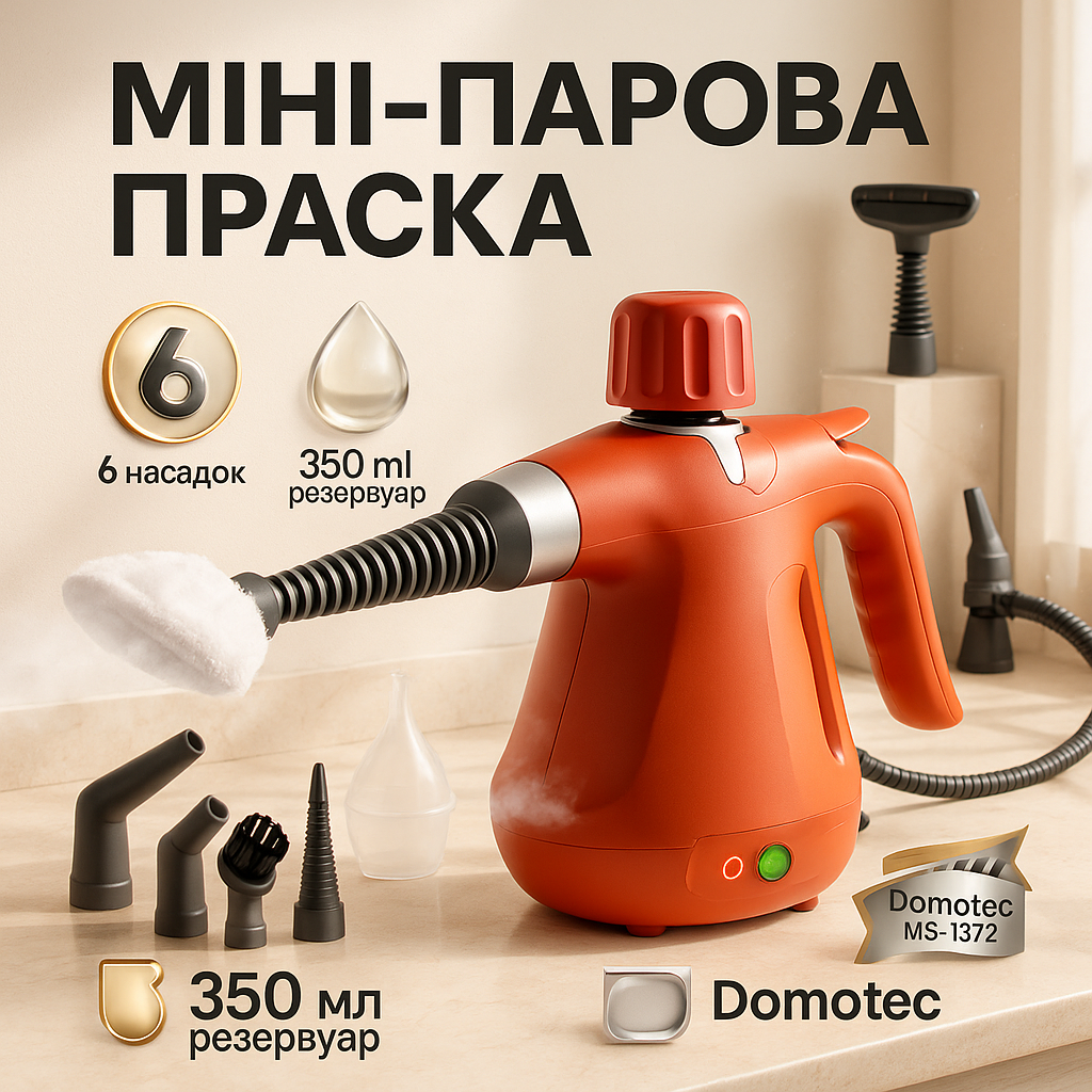 Пароочисник DOMOTEC MS-1372 — універсальний пристрій для швидкого та ефективного прибирання. Завдяки потужності 1000 Вт він виробляє пару високої температури, яка глибоко очищає поверхні. Об’єм бака 350 мл дозволяє працювати досить довго без дозаправки. Пристрій підходить для чищення кухні, ванної, меблів, скла, килимів та навіть автомобільного салону. Гаряча пара не тільки видаляє бруд, а й знищує до 99,9% бактерій та вірусів без використання хімічних засобів. В комплект входять різні насадки: вигнуті та прямі трубки, щітка, вирва, мірна склянка, розпилювачі та подовжувачі для важкодоступних місць. Легка вага та компактний розмір роблять його зручним у зберіганні та перенесенні. Просте керування дозволяє використовувати прилад навіть тим, хто раніше не працював із пароочисниками. Якісні матеріали гарантують тривалий термін служби. З DOMOTEC MS-1372 ваш будинок буде чистим та безпечним для всієї родини.