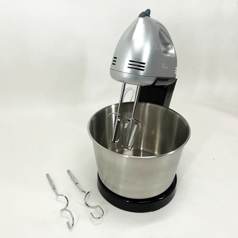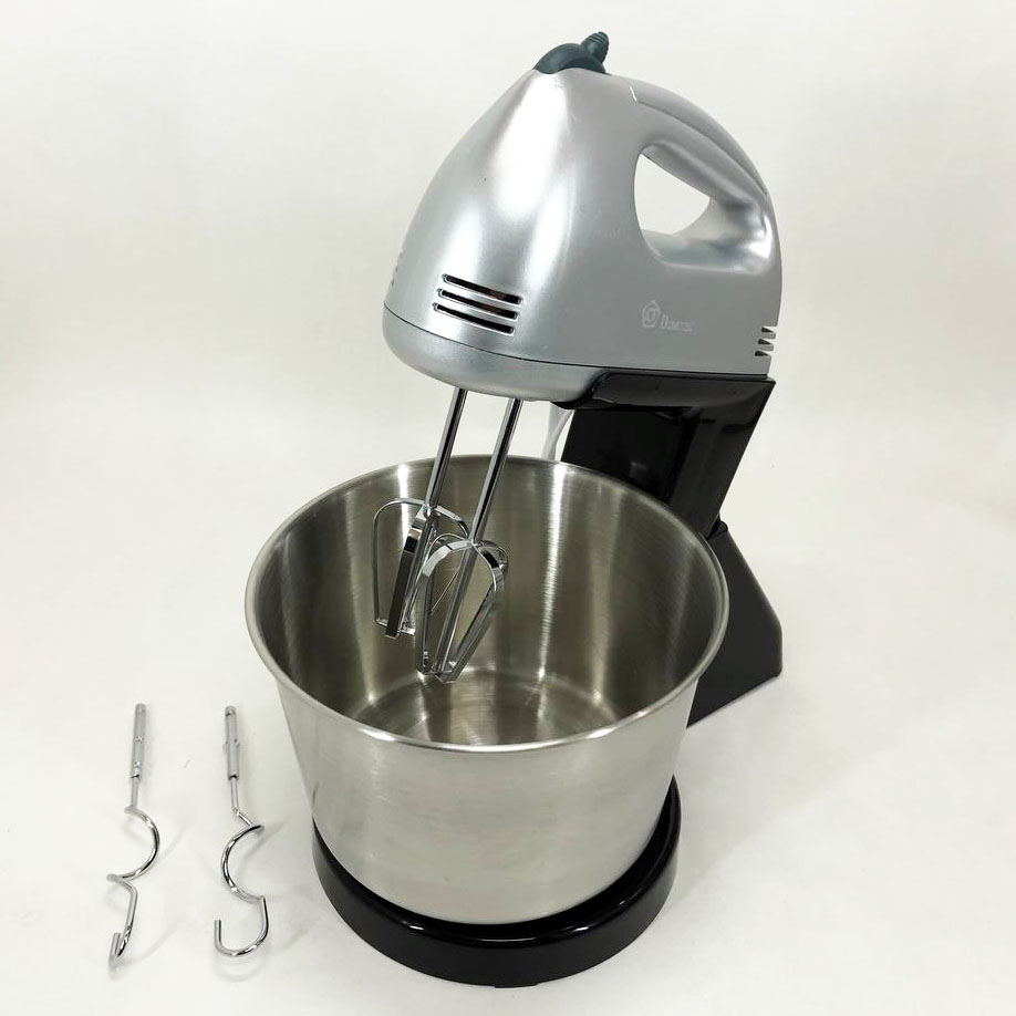 В комплект входить велика чаша, на яку легко встановлюється міксер, тим самим перетворюючи його на стаціонарний прилад, що дозволяє звільнити руки на кухні. Також є два віночки для збивання і додаткові гаки для замішування тіста, що оцінять господині, які люблять радувати свою сім’ю різною випічкою.