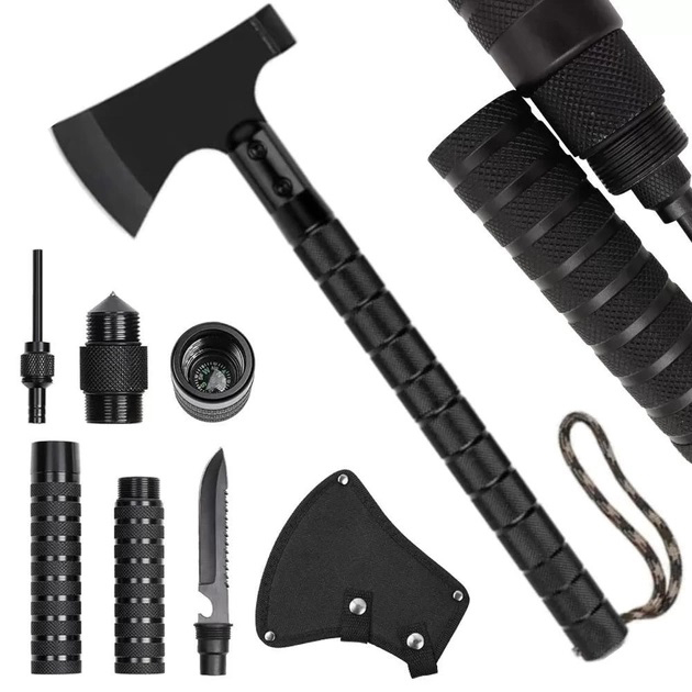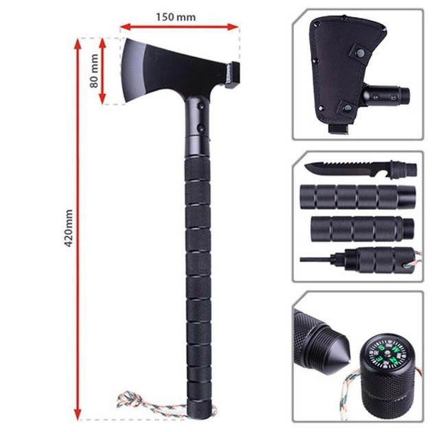 Сокира також має мультифункціональність, в комплекті з ним є невеликий ніж і компас. Ручка сокири розбірна, що складається з трьох секцій, і загальна довжина сокири становить 41 см, що легко вміщується в рюкзаку, не займаючи багато місця. Крім того, у комплекті є захисний чохол, який захистить від можливих порізів про лезо сокири.