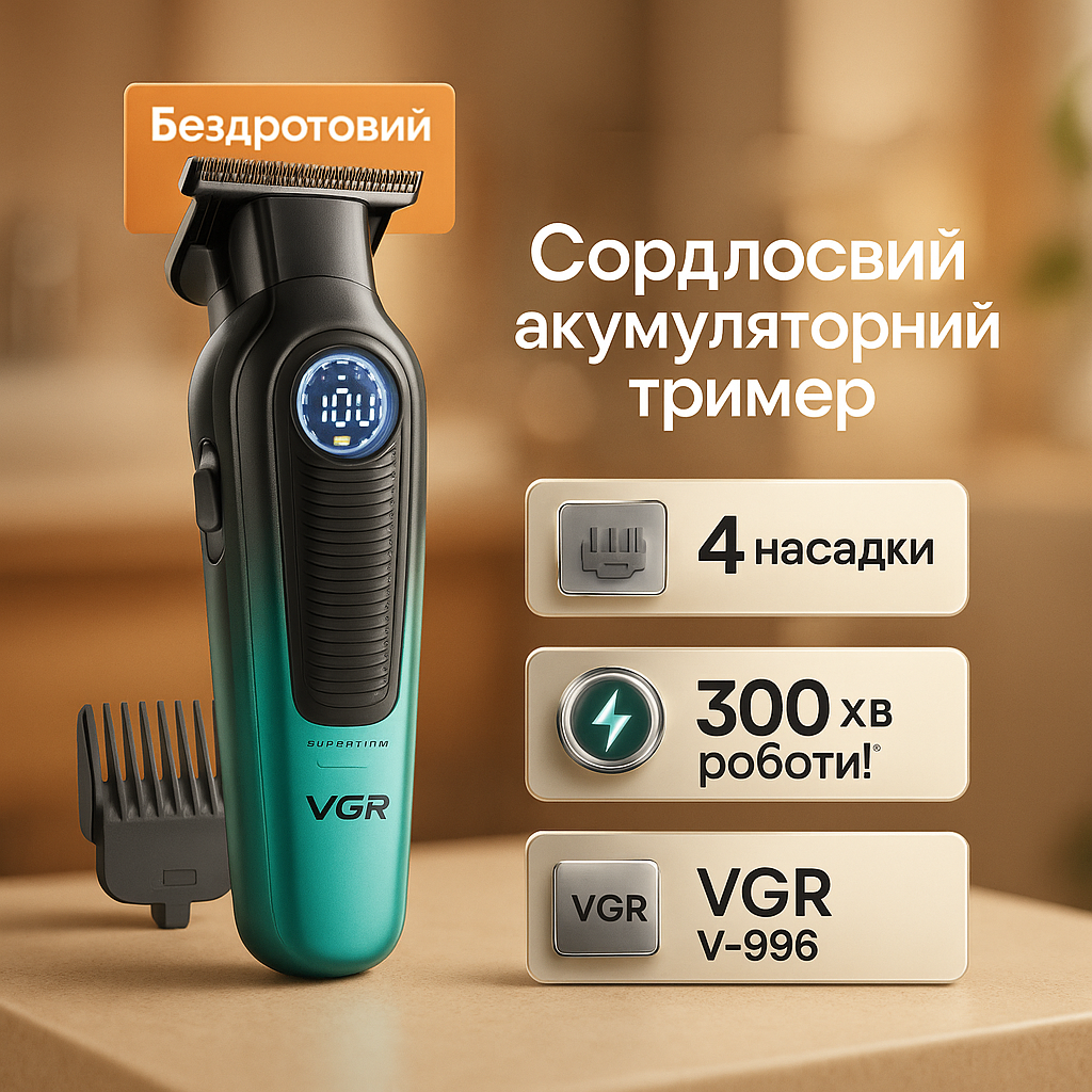 Тример VGR V-996, ви отримуєте надійного партнера для створення стильних зачісок найзручнішим та професійним способом!