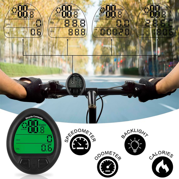Велосипедний спідометр має 2,2-дюймовий екран з 3-рядковим відображенням даних, велосипедний комп’ютер з великими і чіткими цифрами, тому дані можна легко прочитати з усіх боків. дані про поїздку хоошо видно.