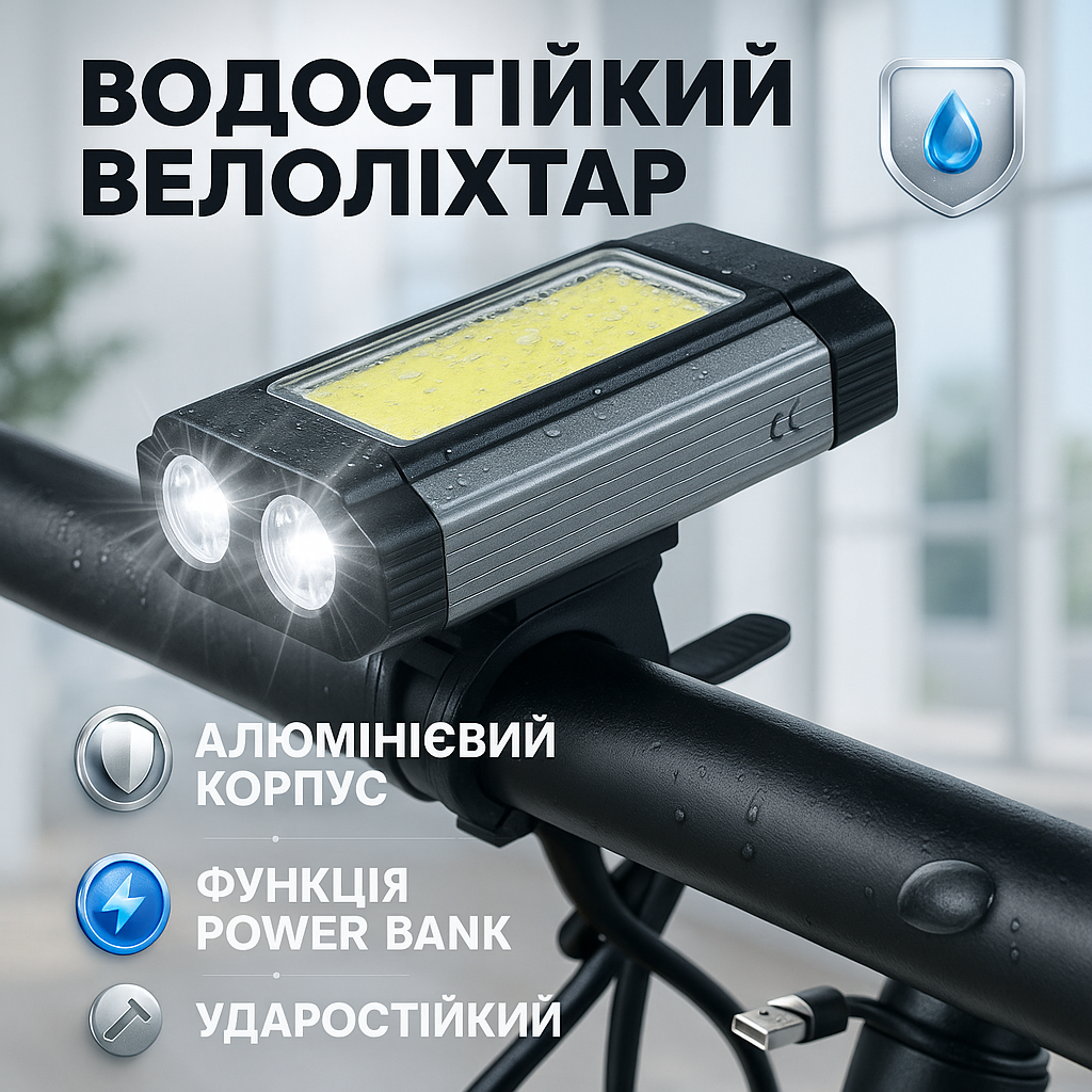 - Функція Power Bank дозволяє заряджати інші гаджети, що підвищує універсальність використання ліхтаря поза межами велосипеда.
